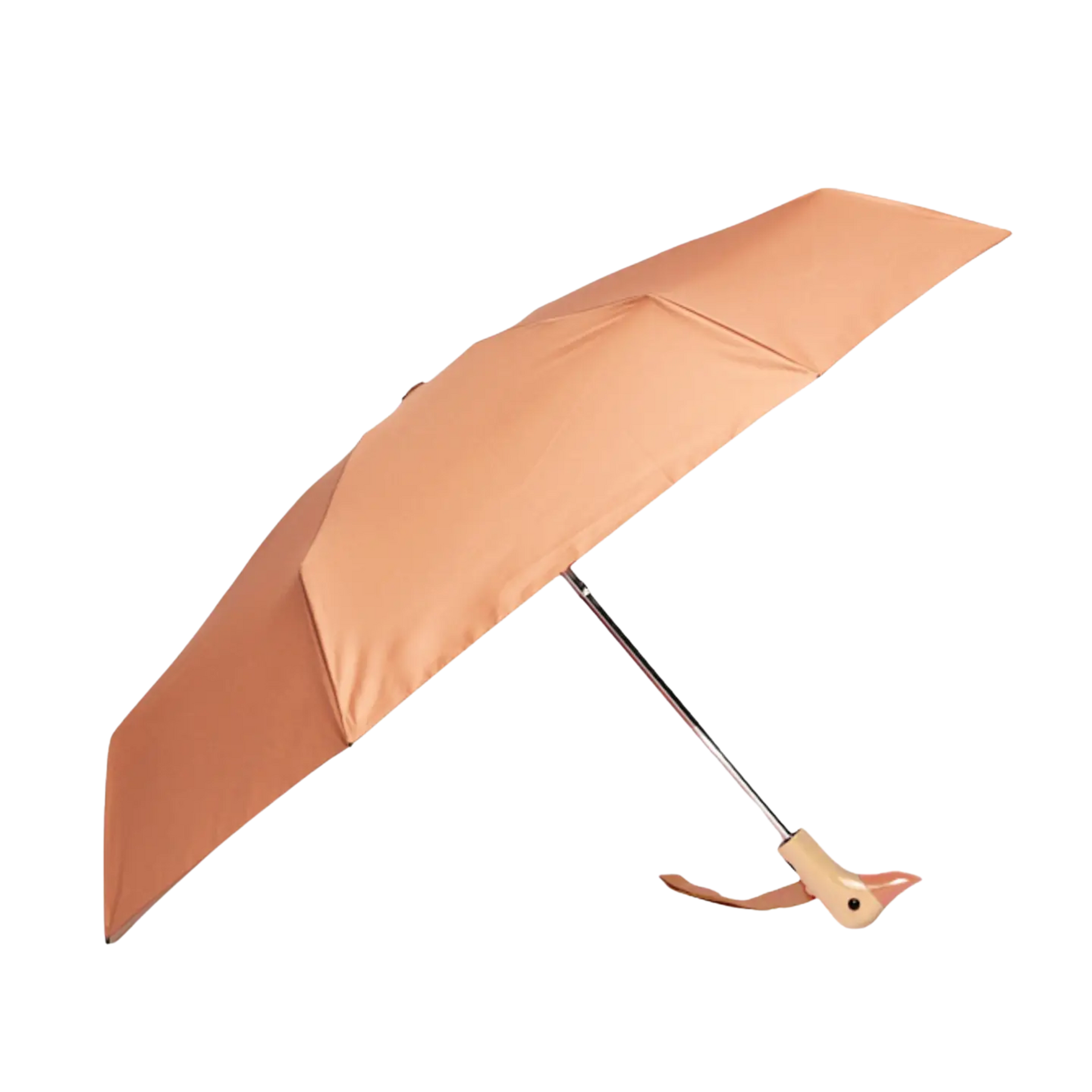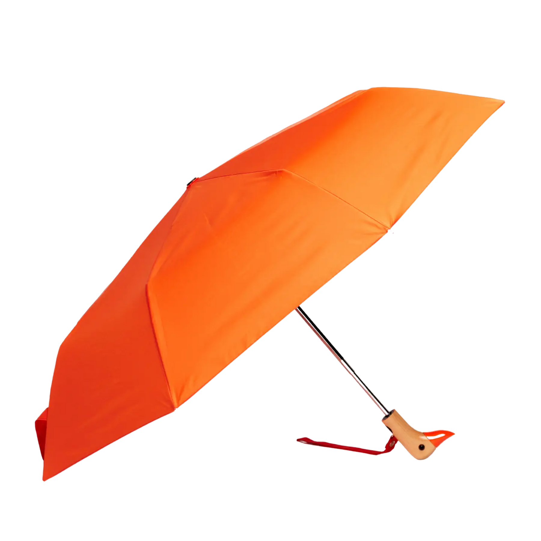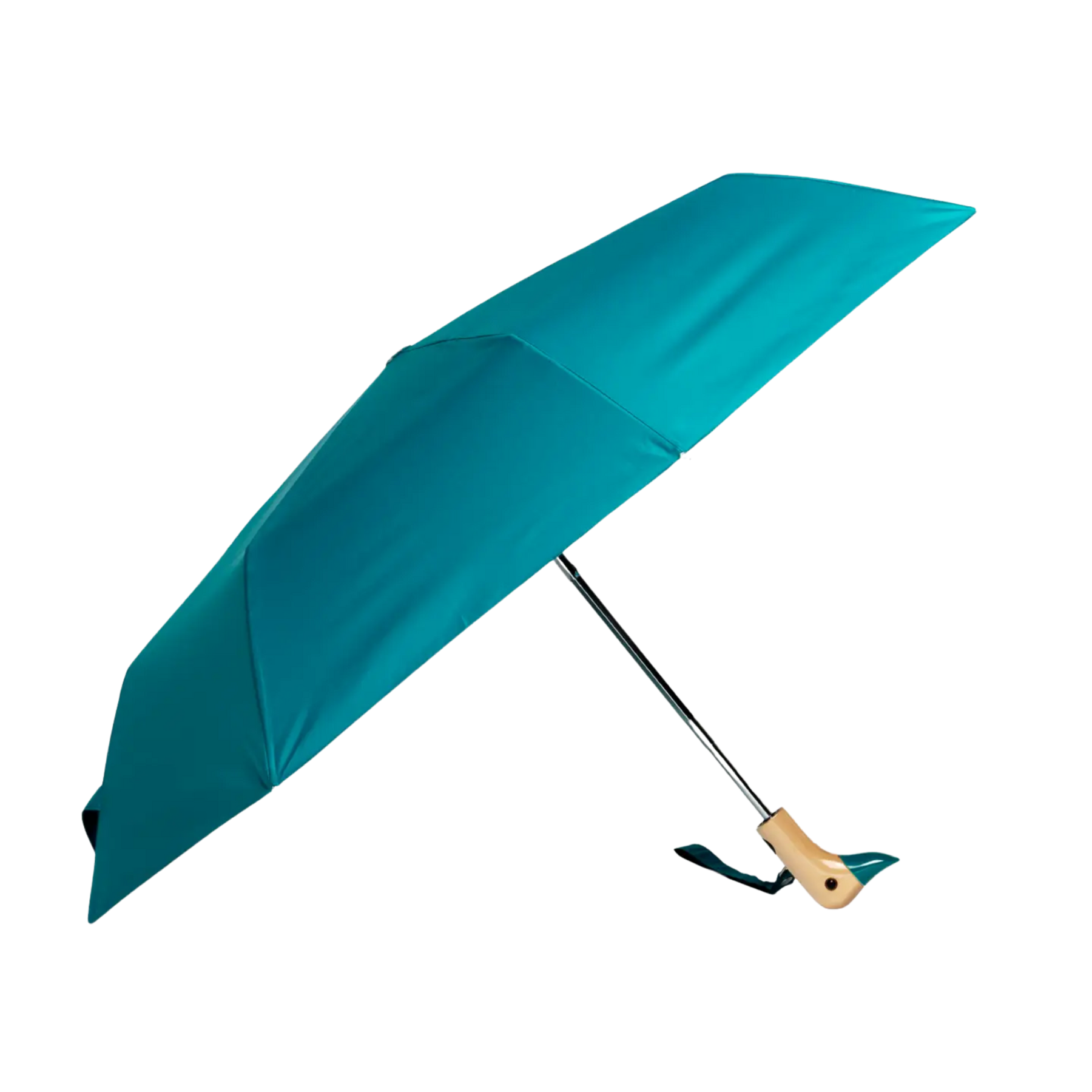This Compact Duck Umbrella is small enough to fit in a tote bag! Handmade 100% Recycled PET fabric made from recycled plastic bottles. Solid wood handle made from sustainably sourced Birchwood. Automatic open button for easy deployment. High strength steel and aluminum frame.