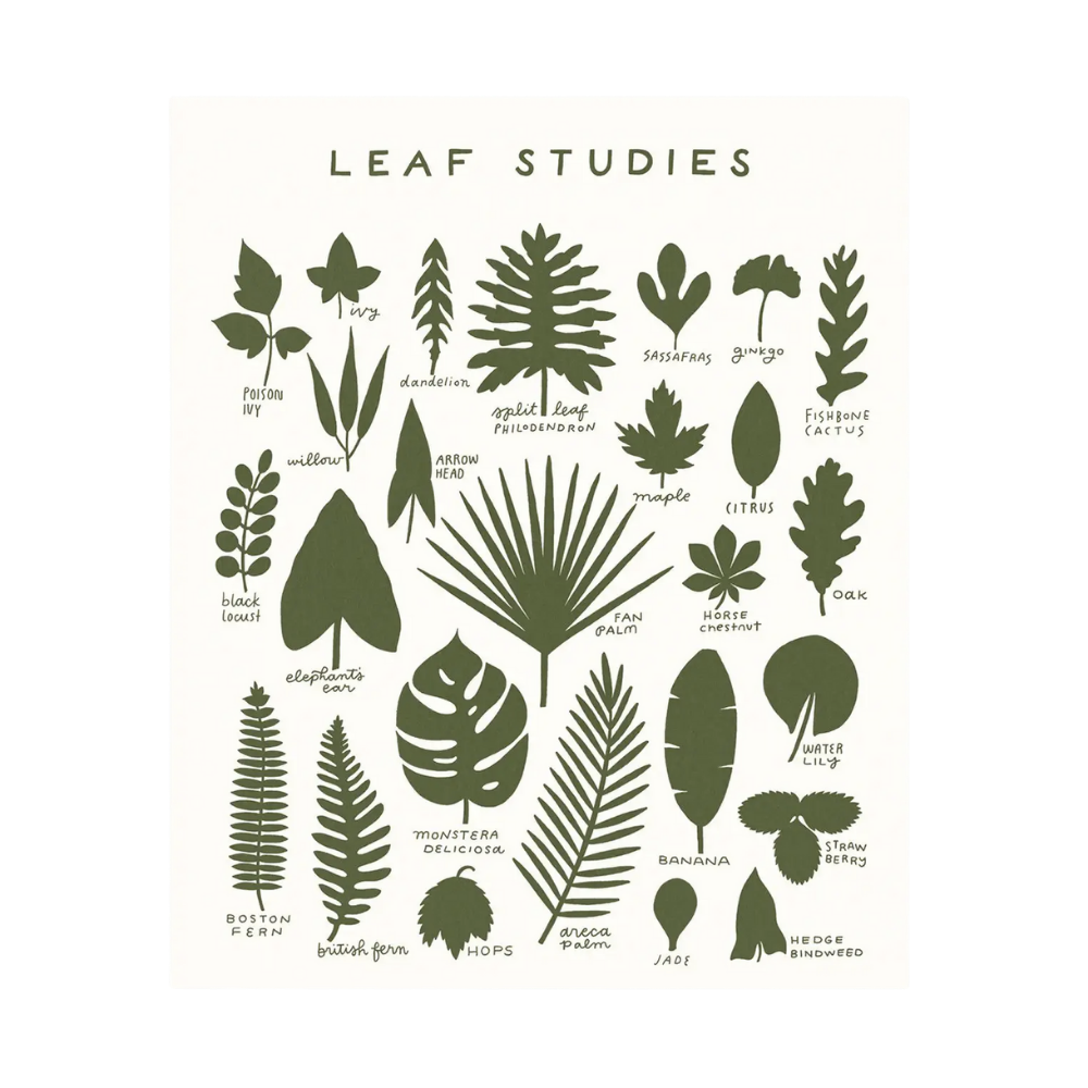 This print catalogs some of the most interesting and fascinating leaf shapes with each leaf silhouette corresponding to the plant it belongs to. Perfect for the nature and plant lover from any geographical area! Completely hand drawn hand lettered and screen printed in dark green ink on heavy black paper stock. Screen printed with water based inks on professional equipment.