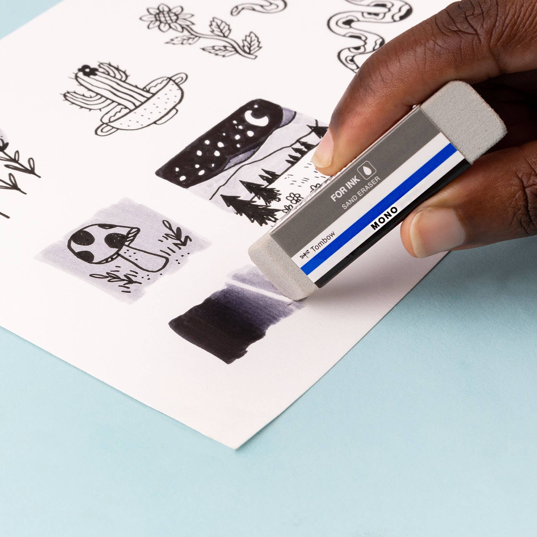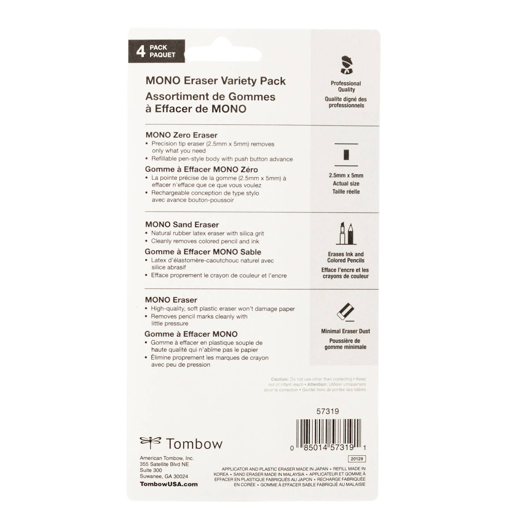 Assorted eraser pack for all your erasing needs. Includes three eraser varieties, including MONO Zero precision eraser and MONO Sand and plastic erasers. Remove graphite pencil, ink or colored pencil markings with precision and ease without damaging your paper! The MONO Zero eraser protects your work by erasing only what you need with high-quality precision that will not damage paper. Refillable pen-style body is easy to use and the 2.5mm rectangular tip provides pinpoint accuracy. Safely remove ink and colored pencil marks with the MONO Sand Eraser, a natural rubber latex eraser with silica grit that will not damage paper. The MONO plastic eraser is a premium eraser that cleanly removes graphite pencil lines with little pressure.