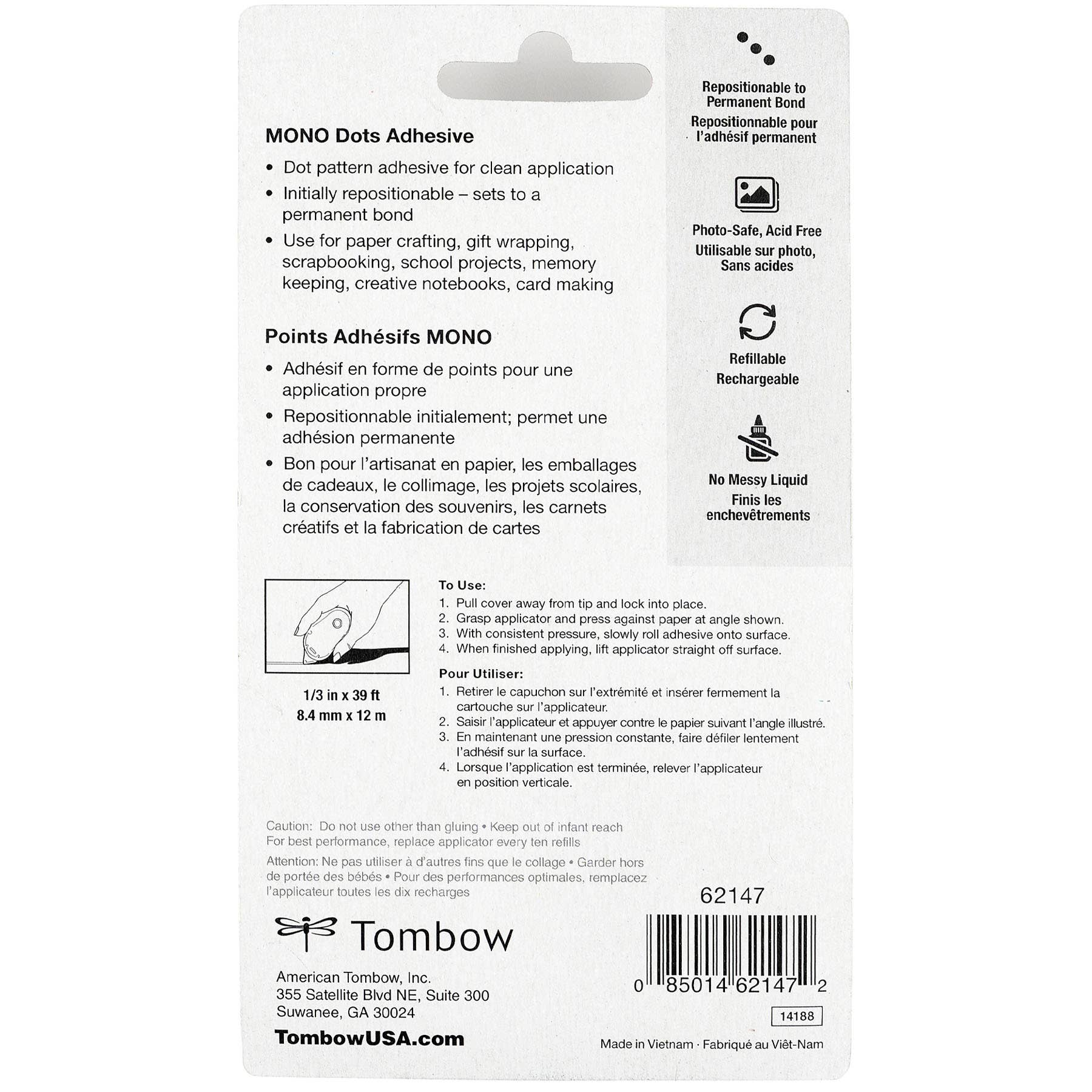 Compact applicator with roller tip for smooth application in either a straight or curved line for exact placement. Unique diamond dot pattern adhesive is initially repositionable and sets to a permanent bond. Simple to refill with a snap-in cartridge. Acid-Free and photo safe make it safe for use with archival materials. 1/3 in x 472 in. Refillable. Permanent Bond.