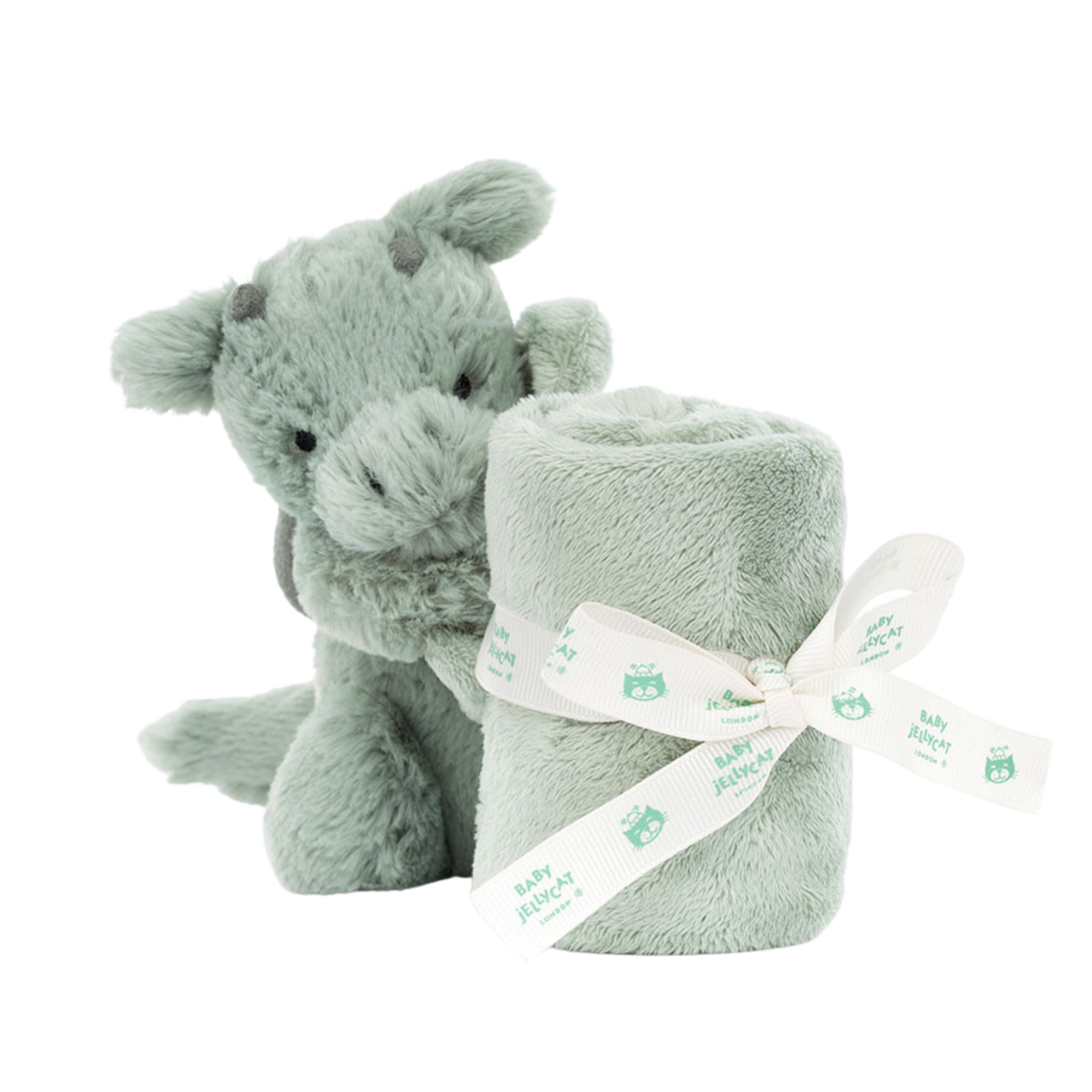 Bring a little enchantment to naptime with the Bashful Dragon Soother! This moss-green cutie clings to a dreamy-soft blankie, made from recycled fibers and perfect for snuggles, soothing, and sleepy spells. Rolled up with a Baby Jellycat ribbon, it’s a thoughtful gift for new arrivals or any little dragon-in-training.