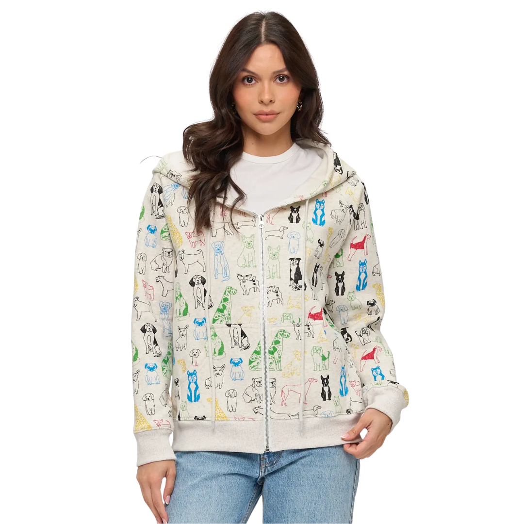 Unleash your playful side with the Colorful Graphic Dogs Print Zip Up Hoodie! This cozy full-zip features a vibrant all-over print of stylized pups, drawn in bold, outline-style graphics. Each dog is uniquely rendered in a cheerful palette of blues, reds, yellows, greens, and blacks, coming together to create a lively, artistic scene against a soft background.