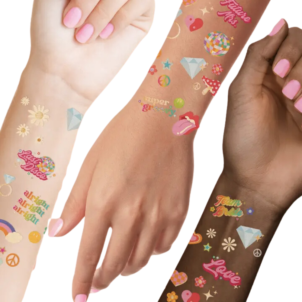 Colorful. Groovy. Good Vibes. Your bestie is engaged, and now it’s time to celebrate! Bring on the groovy bride vibes with Groovy Bachelorette, a 2 sheet collection of bachelorette-inspired metallic temporary tattoos featuring retro designs.