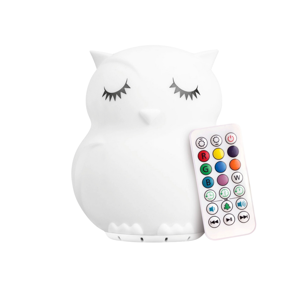 Features: • USB rechargeable battery • 9 vibrant light color choices with brightness control • Soothing slow fade option • 3 sleep timer settings • Machine washable silicon cover. BPA Free. Doesn't get too hot. • Smaller portable size Ages zero plus. Size 4” x 4”x 5". Includes lumipet, remote, and USB cord.