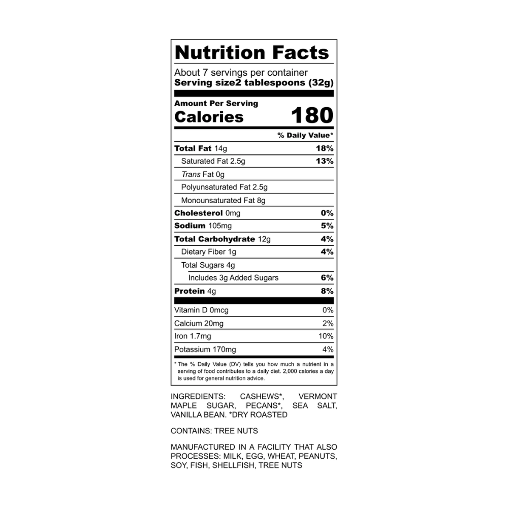 Cashews, Vermont Maple Sugar, Pecans, Vanilla Bean, Salt