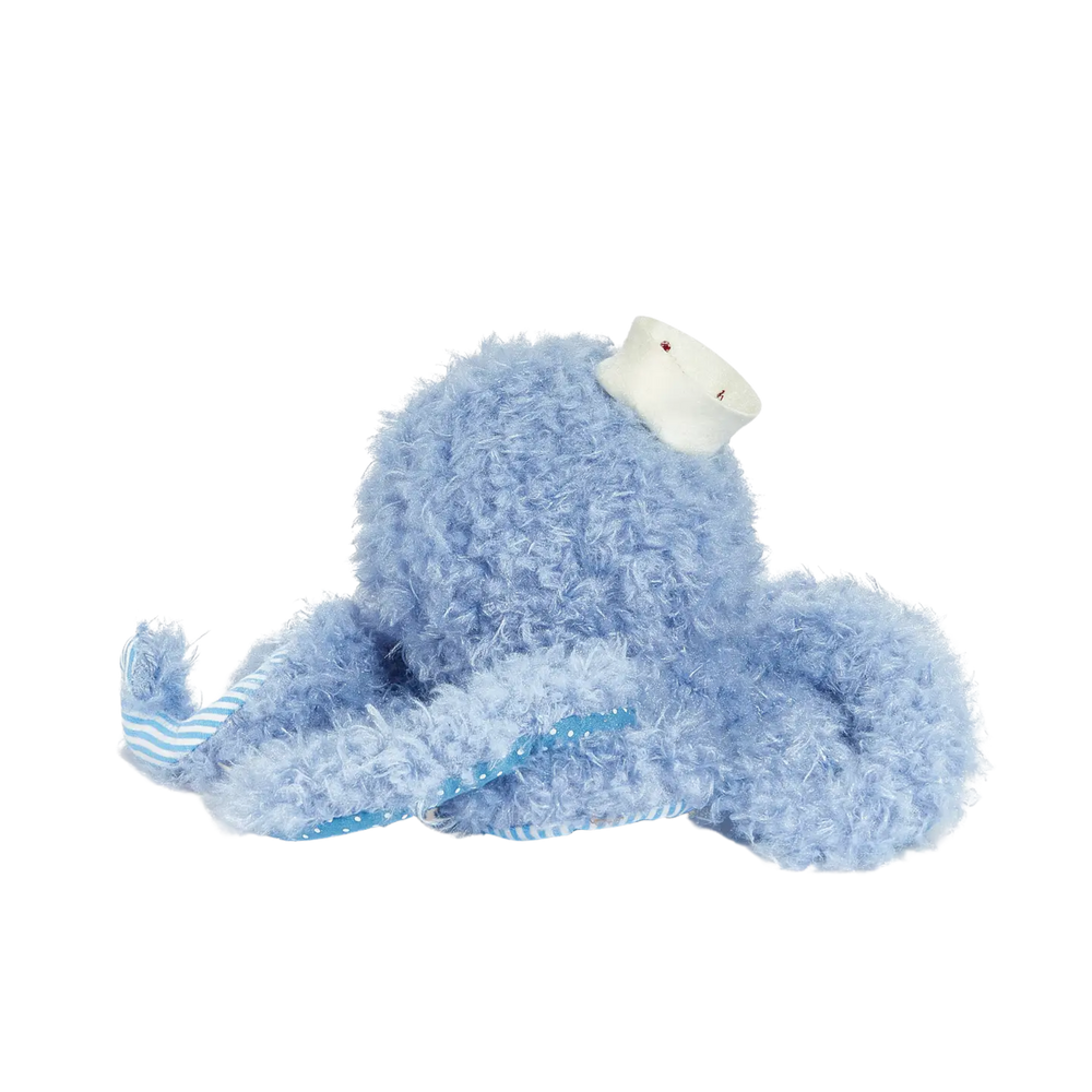 Meet Ocho the Octopus, the cheerful and cuddly ocean buddy with eight twining arms perfect for twisting, twirling, and endless play! With a fuzzy marina blue fur body, striped and polka-dotted arm linings, and a jaunty sailor hat, Ocho is as charming as he is snuggly. His embroidered face and multiple textures make him a delight for little hands to explore.