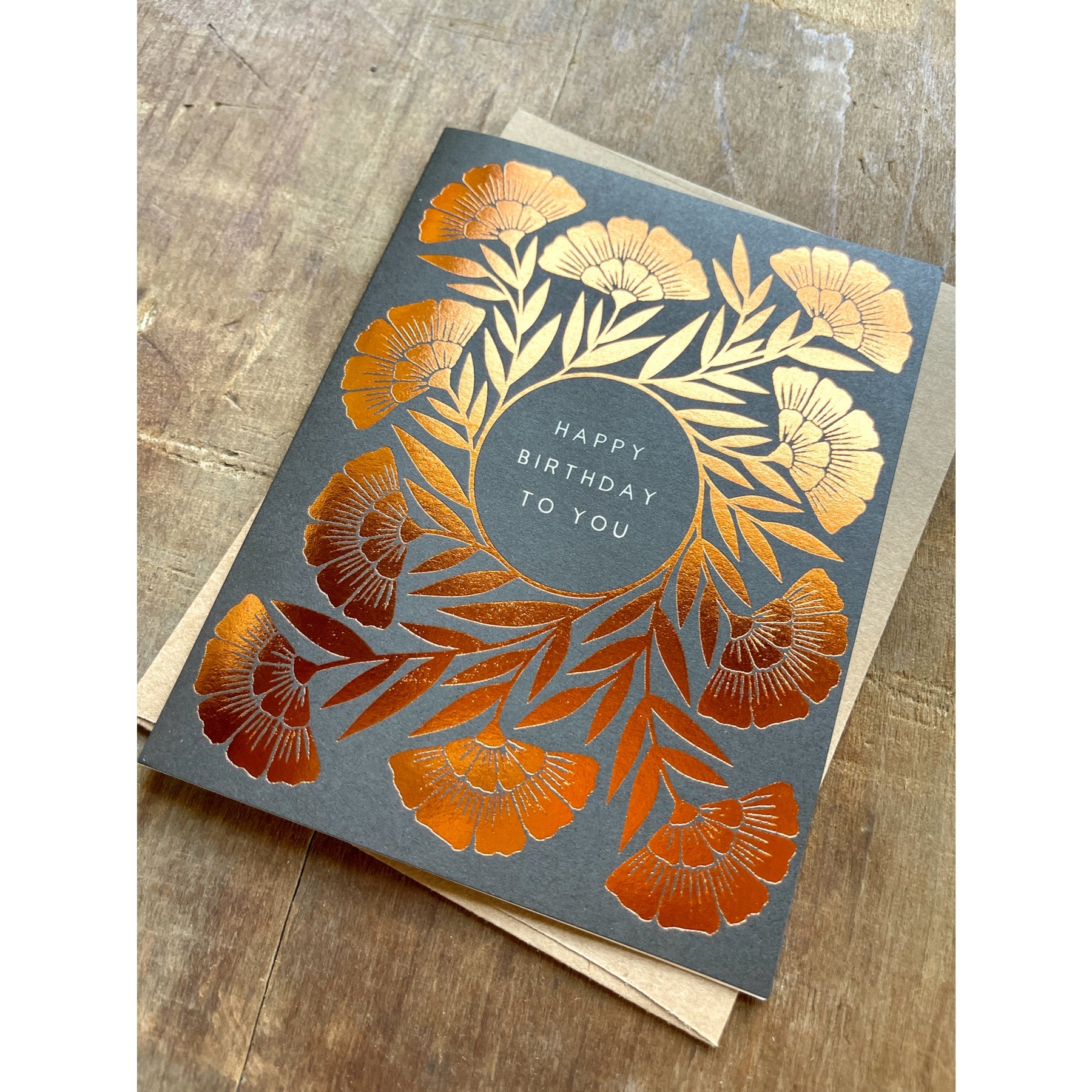 Each design begins with a watercolor painting or hand-carved linoleum block, which is turned into a greeting card design and individually foil-stamped. Single cards are packaged in individual sealed cello sleeves.