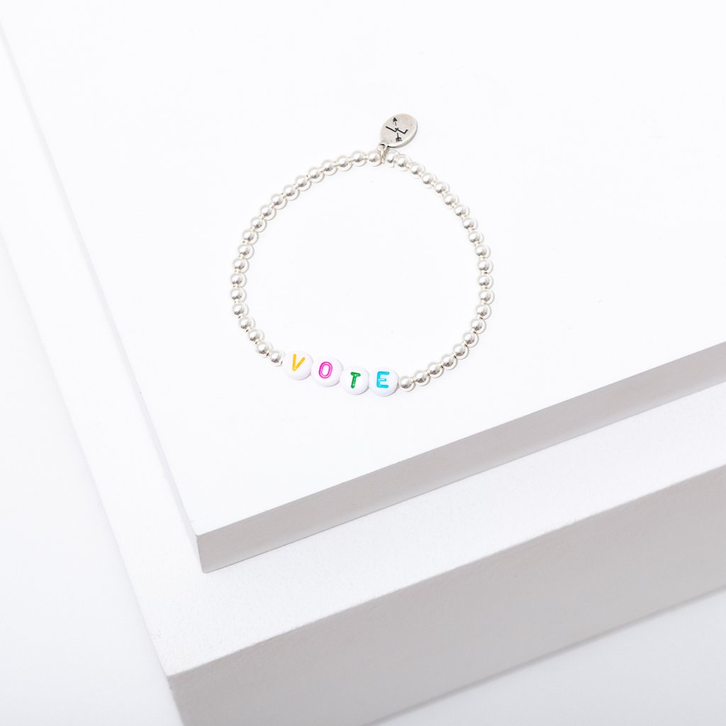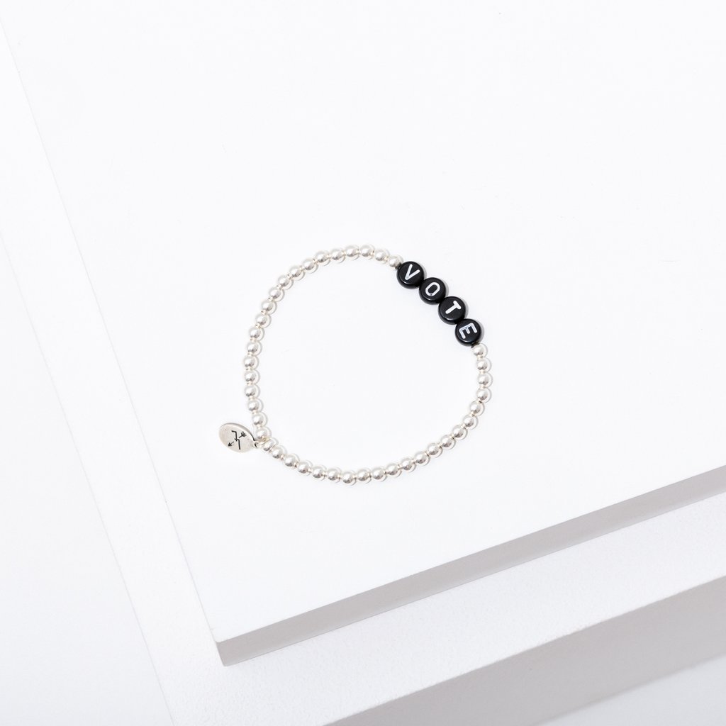 This babe features your choice of 14k gold filled or sterling silver beads - plus your choice of black or rainbow letter beads - on a stretchy band with the phrase VOTE.