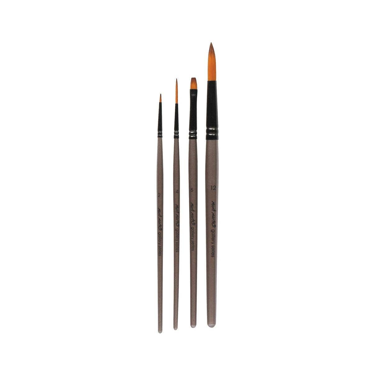 Beautiful taklon brush set with sleek gun metal grey wooden handles and black ferrules. Includes 4 brushes (1 x Detailer 2, 1 x Liner 4, 1 x Round 12 and 1 x Flat 5)