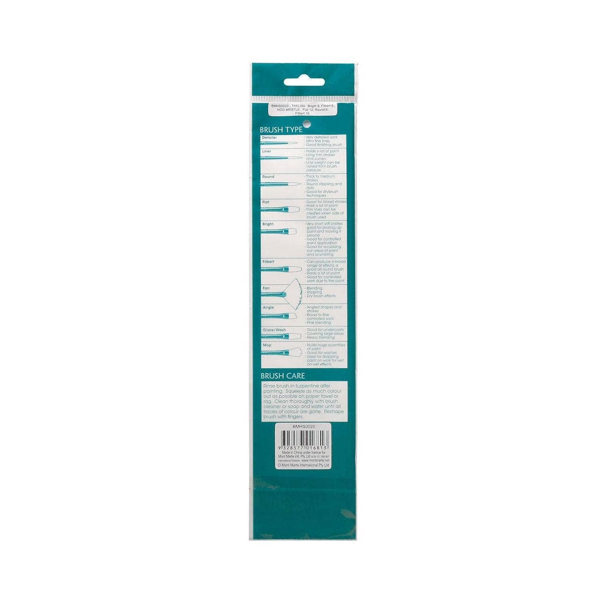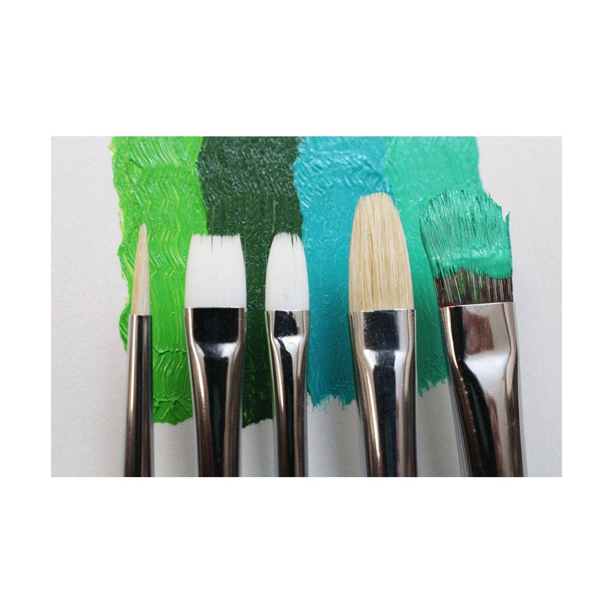 Beautiful brush set with green wooden handles. 5 brushes included (1 x Taklon Bright 8, 1 x Taklon Filbert 6, 1 x Hog Bristle Flat 12, 1 x Hog Bristle Round 6 and 1 x Hog Bristle Filbert 10)