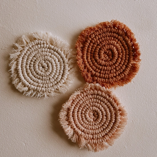 Made from organic cotton, these spiral macrame coasters are the perfect resting place for your drinks or candles. The texture brings warmth and design to any space while also being a practical solution.