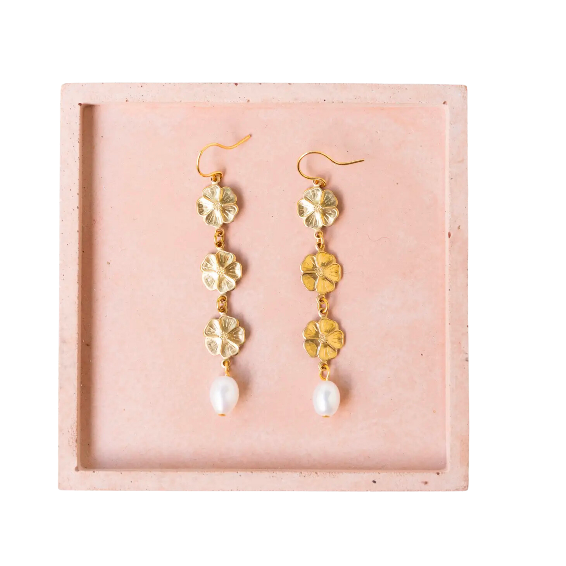 A sweet pair of long 2.5" earrings with three golden brass beautifully detailed flowers and small 5mm freshwater pearls, the ear wires are 24K gold plated.