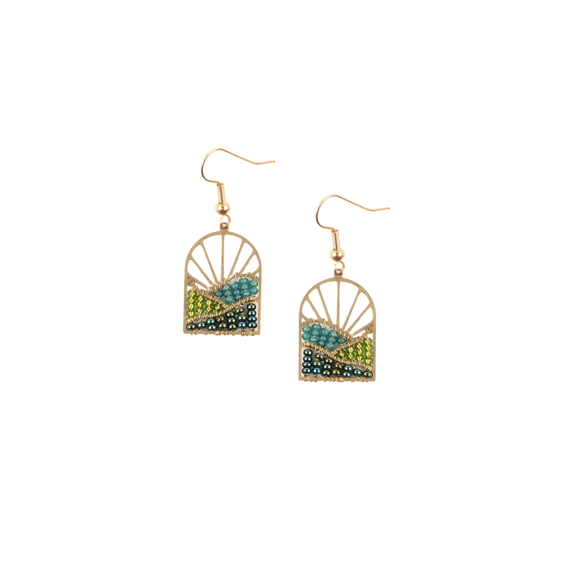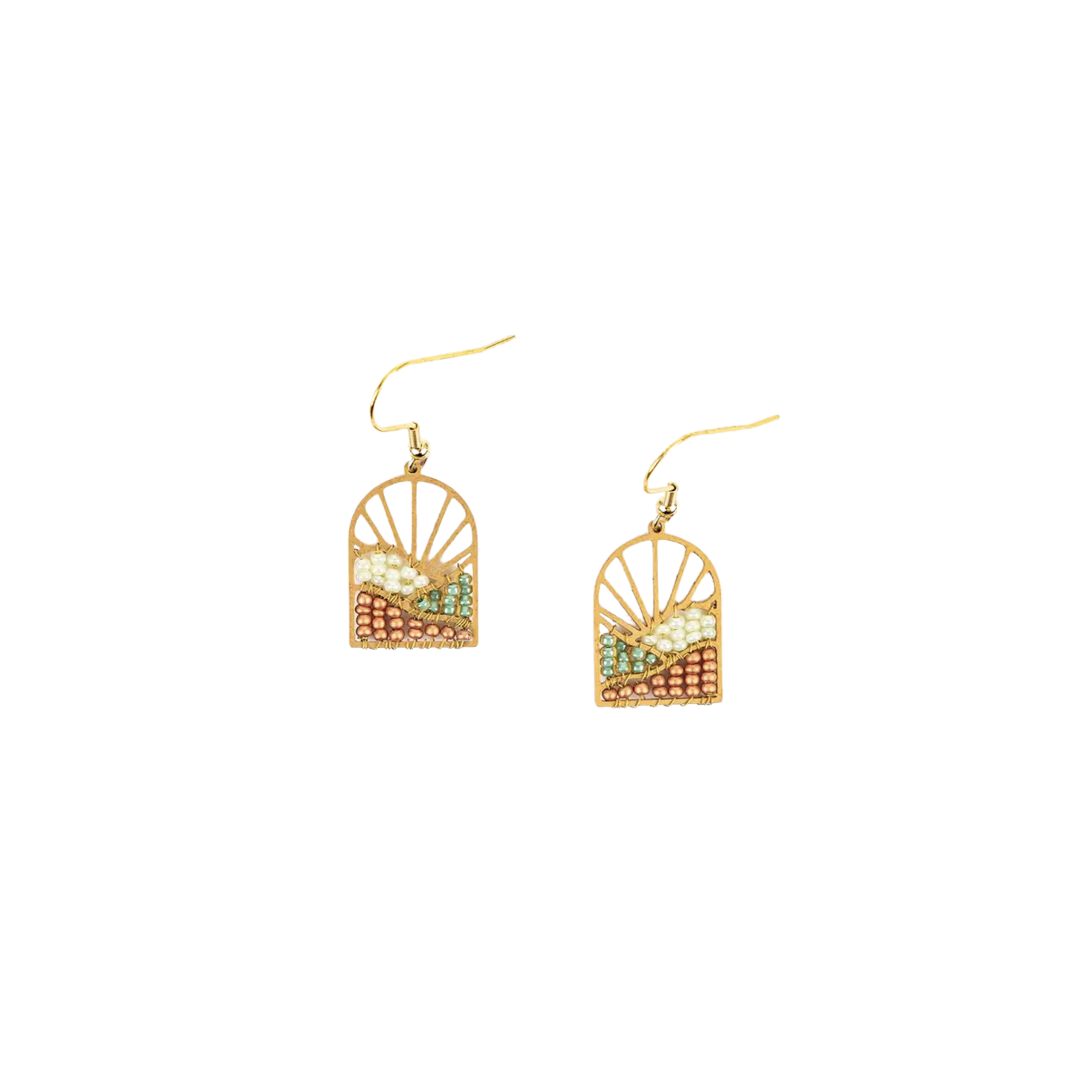 Rise and shine with the Sunrise Brass & Bead Earrings! ✨ A bold brass sunrise motif is accented with colorful glass beads, creating a vibrant design full of movement and light. Long, radiant, and eye-catching, these earrings are a true statement piece.