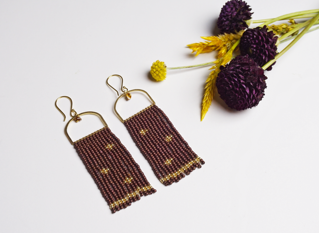 Medium Forged Brass Rectangle Earrings w/ Heishi