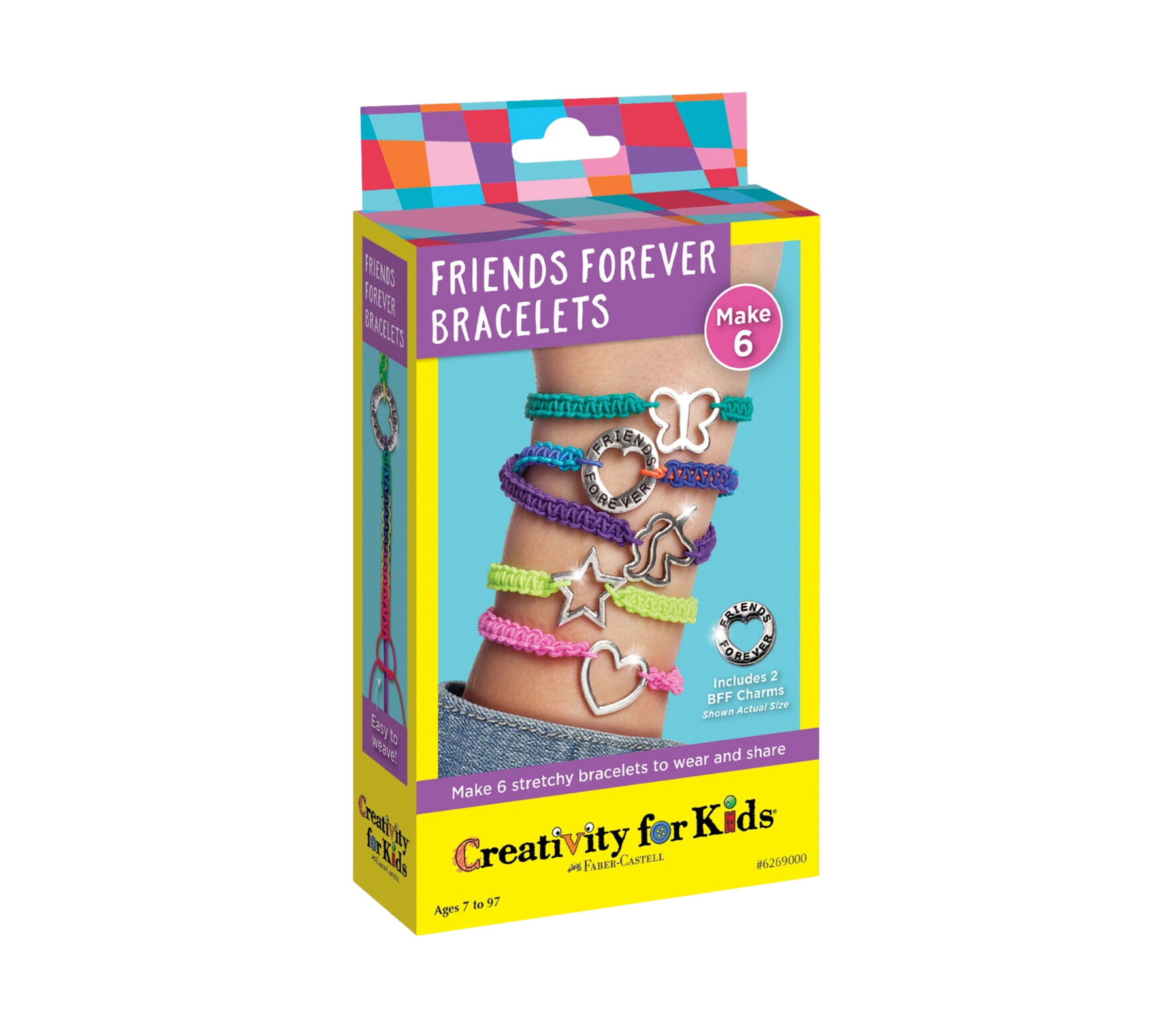 Comes with everything you need to create 6 charm bracelets for kids just add creativity and imagination! Includes 6 strands of elastic cord, 6 silver-tone charms, 6 pony beads, a needle threader and illustrated instructions Great group activity! Friends Forever Bracelets is an easy jewelry making kit that is perfect for your next party, sleepover or play date Personalize your bracelets by adding charms (unicorn, butterfly, star, heart and 2 BFF charms) and creating unique braids with included colored elastic cord!