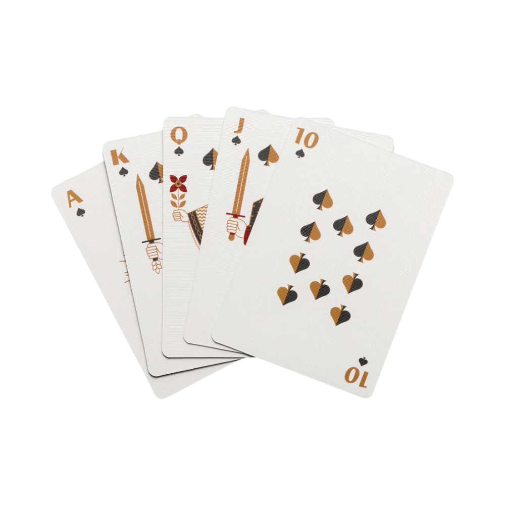 This is a standard poker size 52 card deck with a gold foil stamped tuck box and gold foil stamped cards that are custom designed and unique-