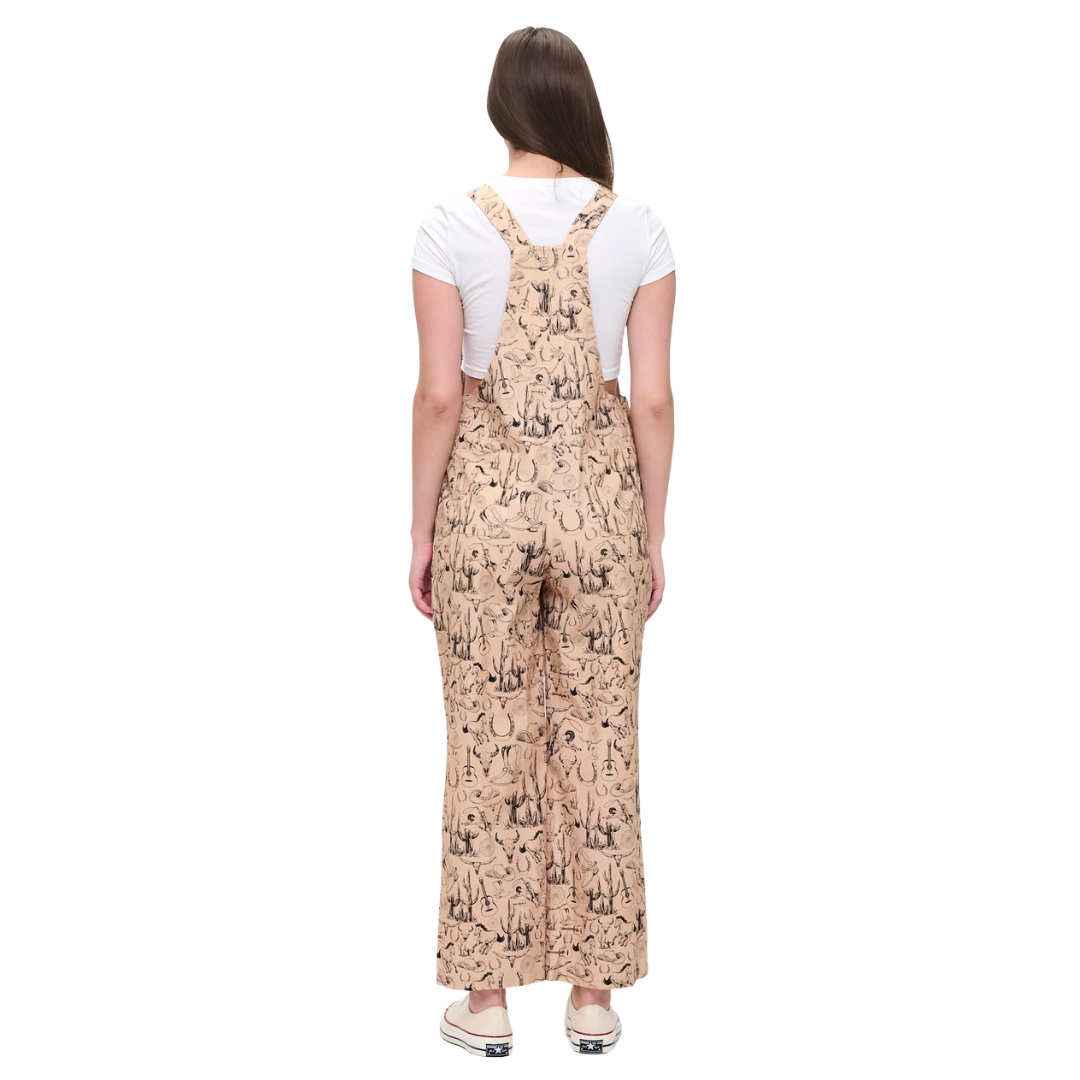 Giddy up, fashion fans! These statement-making overalls feature sketch-style horses, steer skulls, and desert cacti, all printed in bold black ink on a sandy beige backdrop. It’s giving high-desert daydreams meets art class doodles 🖊️🌵