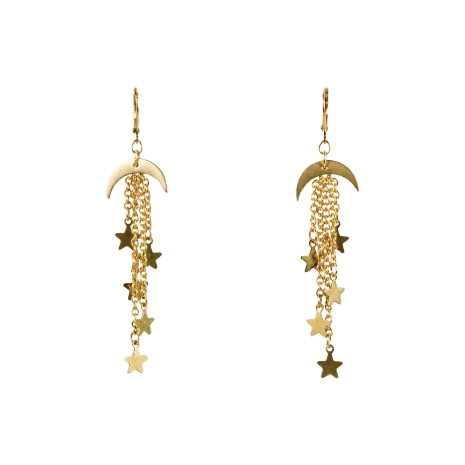 With a delicate crescent moon and a cascade of falling stars, the Moon & Star Dangle Earrings are the perfect accessory for those who love all things celestial. Light-catching and graceful, these earrings add an ethereal touch to any outfit. Handcrafted in a fair trade workshop in Guatemala, they blend artisanal craftsmanship with cosmic beauty.