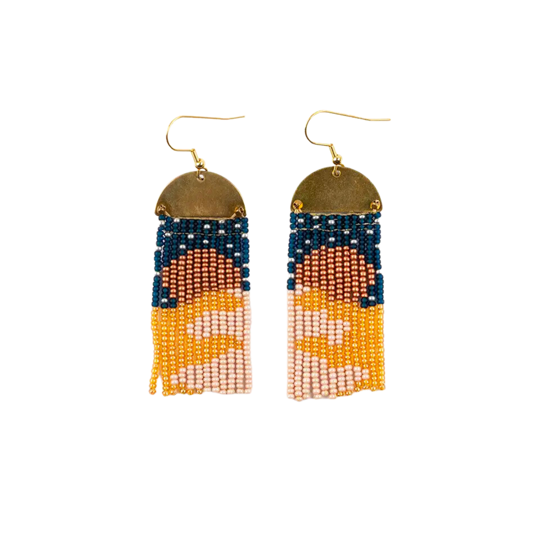 A starry night and moonrise reflect on the landscape in this gorgeous beaded fringe earring topped by a brass half moon.