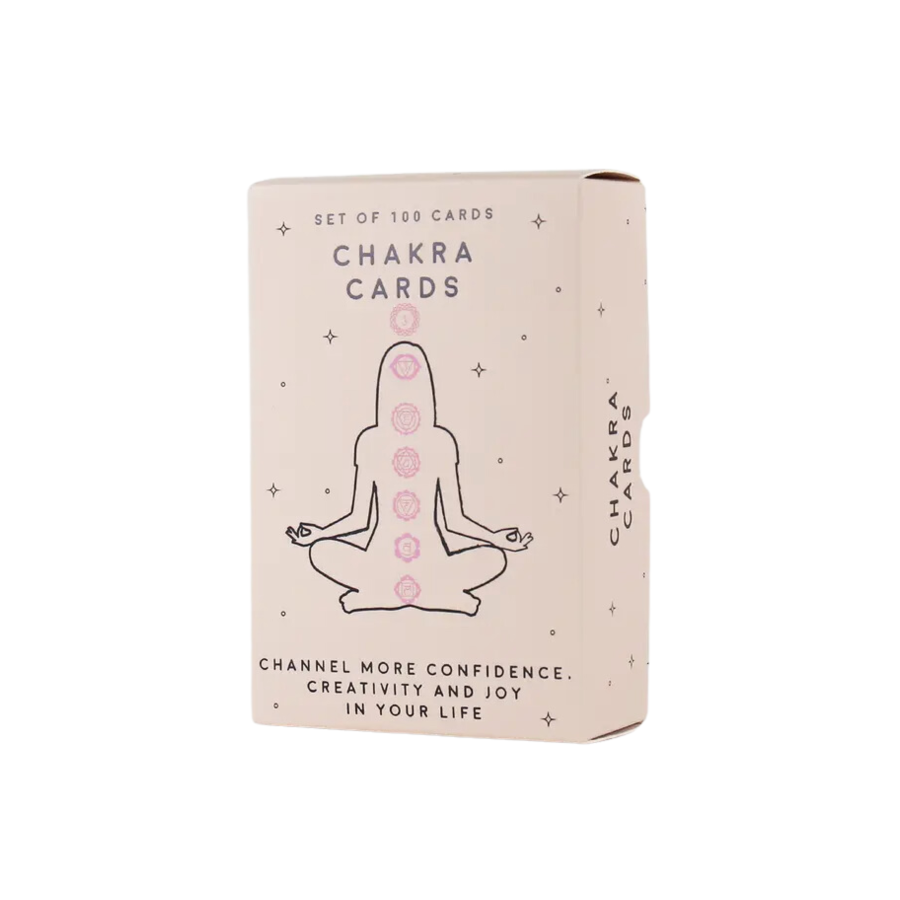 Box with body outline and 7 chakras text reading "Set of 100 Chakra Cards" and "Channel More Confidence. Creativity and Joy in Your Life".  Are you ready to start a journey of self-discovery and unlock your hidden energies and power? These cards will guide you on through each of your seven major chakras and send you on the road towards enlightenment.
