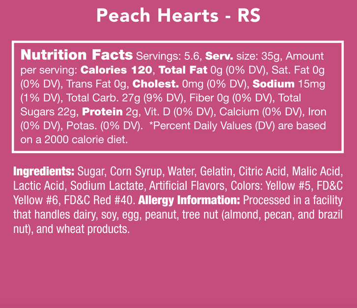 Sweet, tangy, and totally irresistible—these sugar-coated, soft and chewy heart-shaped gummies burst with juicy peach flavor in every bite! Perfect for gifting, snacking, or adding a little love to your candy jar.