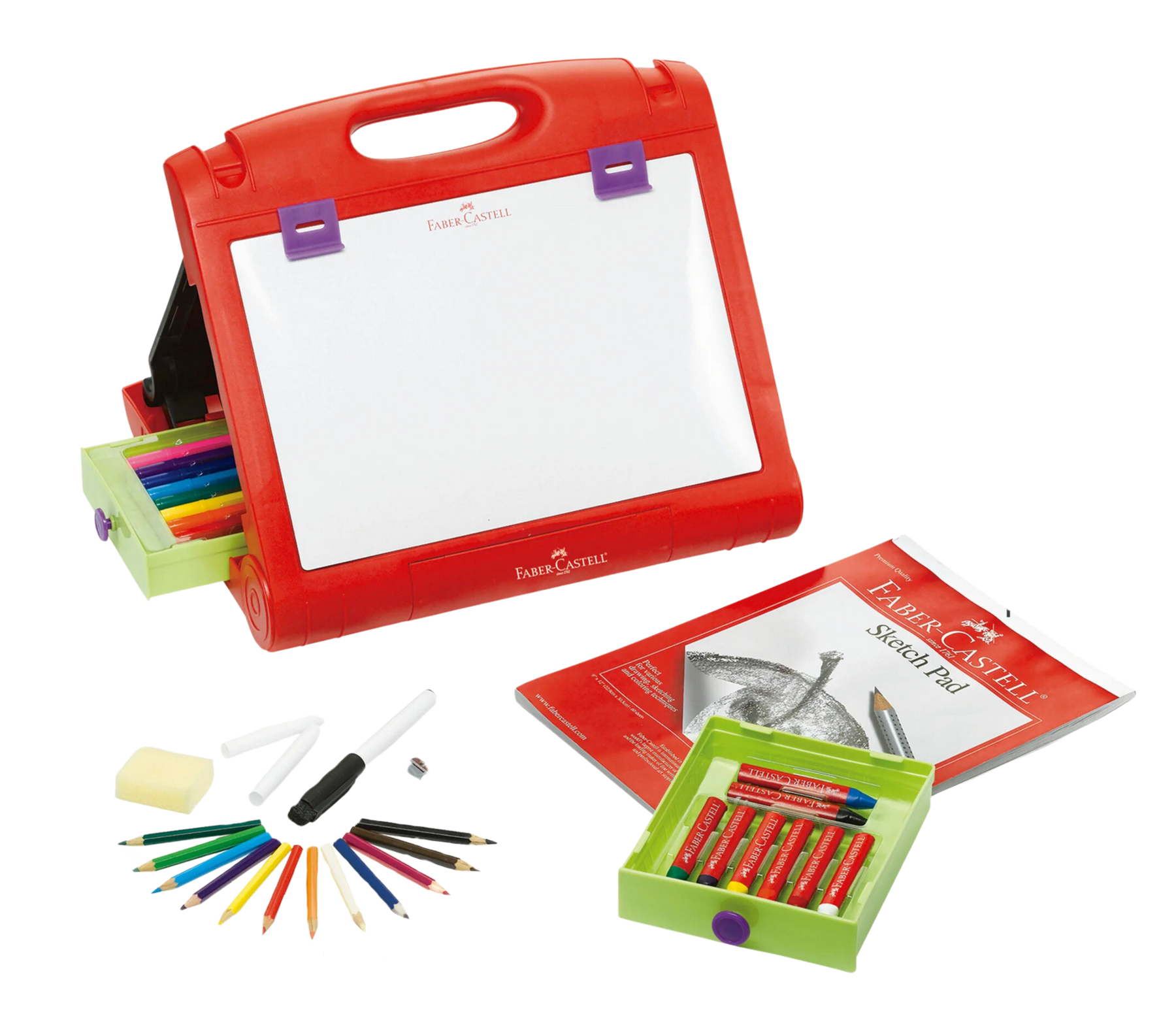 Easily carry your tabletop easel with the top handle and snap case. Multifunctional surfaces allow for unlimited art creations! A 3-in-1 art easel for kids can be used as a drawing easel, whiteboard, chalkboard, or lap desk! The easel measures 14" w x 13" h x 2.5" d high-quality art supplies are recommended by art educators. See your art come to life in vibrant color with faber-castell quality art supplies for kids.