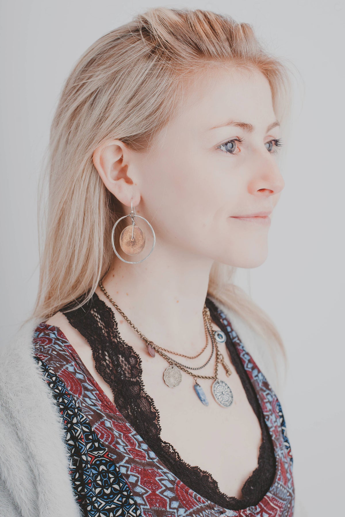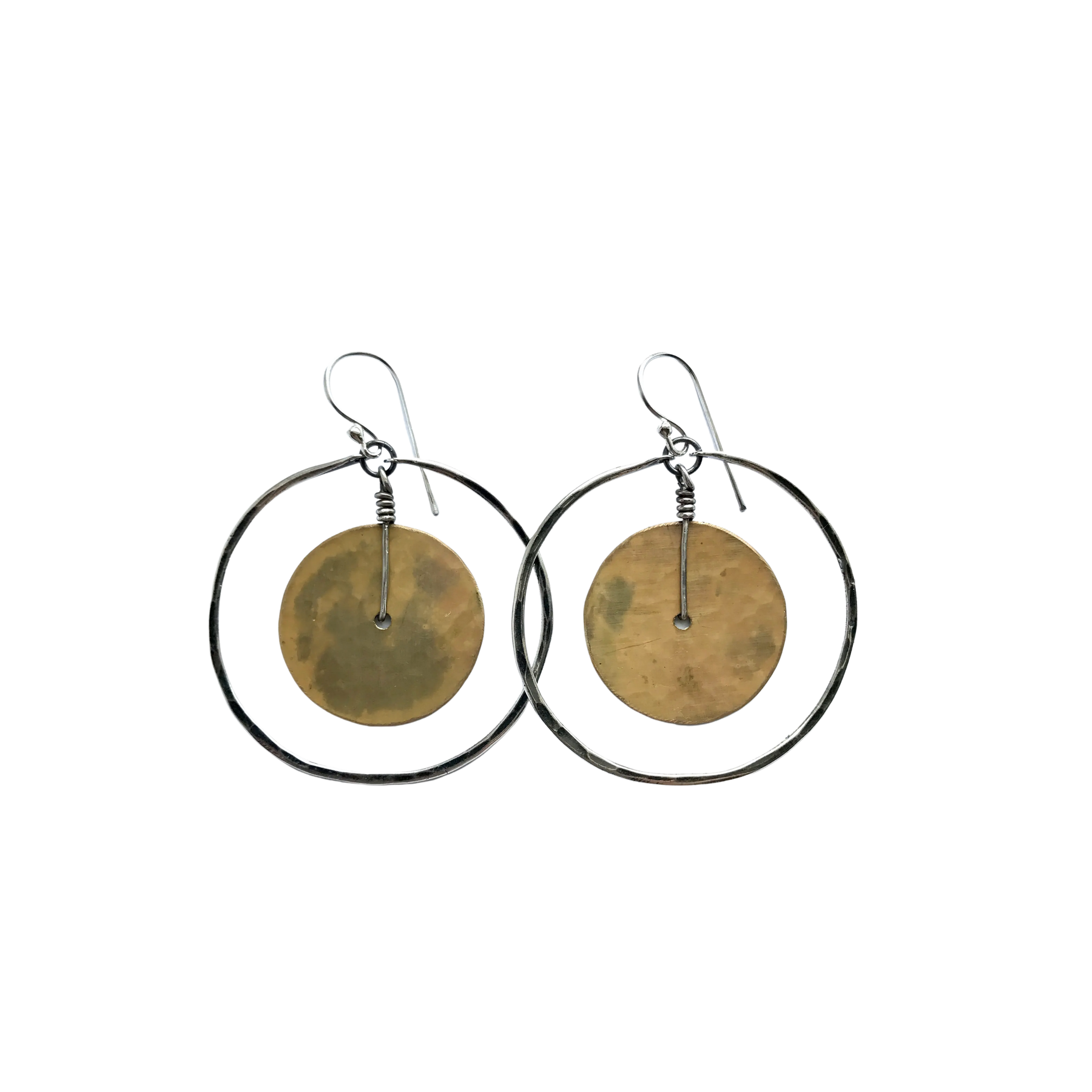 Circles within circles, within circles… a beautifully organic and balanced design. These earrings feature hammered brass disks paired with oxidized, forged sterling silver circles, creating a bold yet lightweight statement. Their versatile style makes them perfect for both casual and dressy looks.