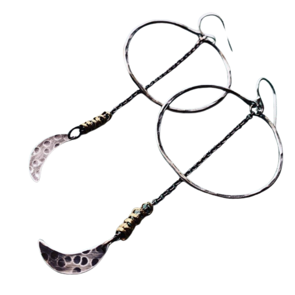 Petite but long and sexy! These moon earrings feature tiny hammered crescent moons and brass heishi beads. Oxidized sterling moon connected to an oxidized sterling chain. Jewelry for a Goddess.
