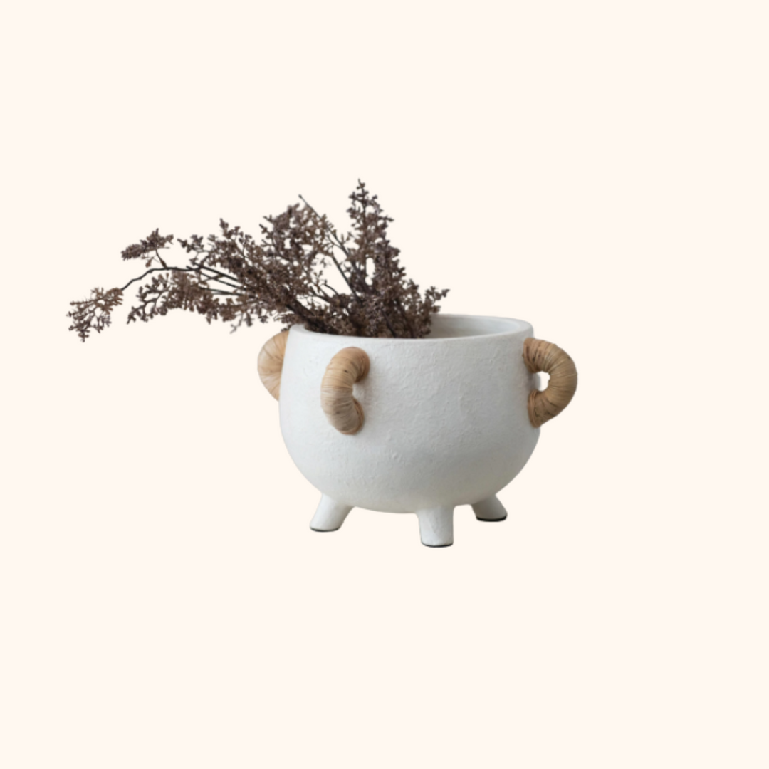 Terracotta Footed Planter, Rattan Wrapped Handles