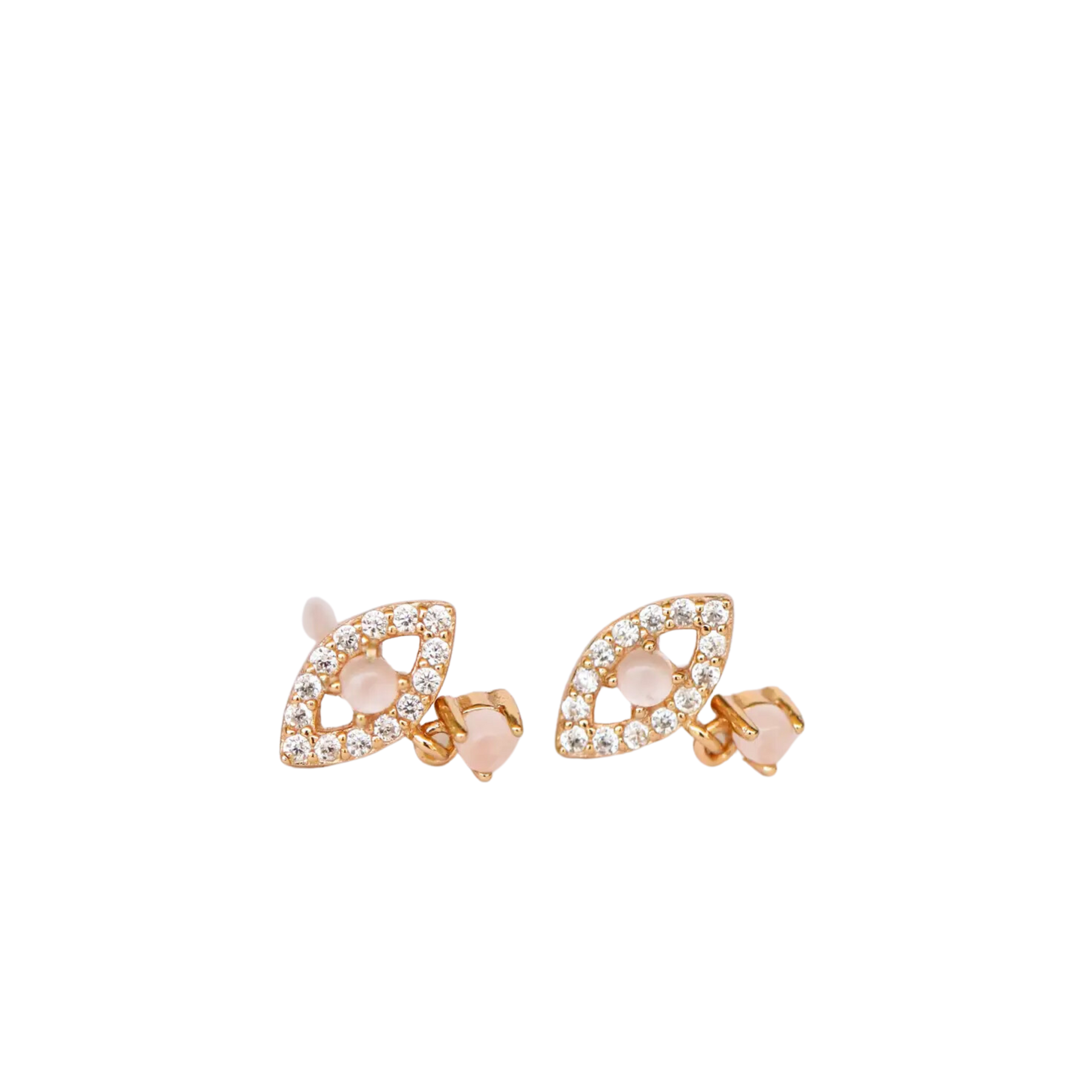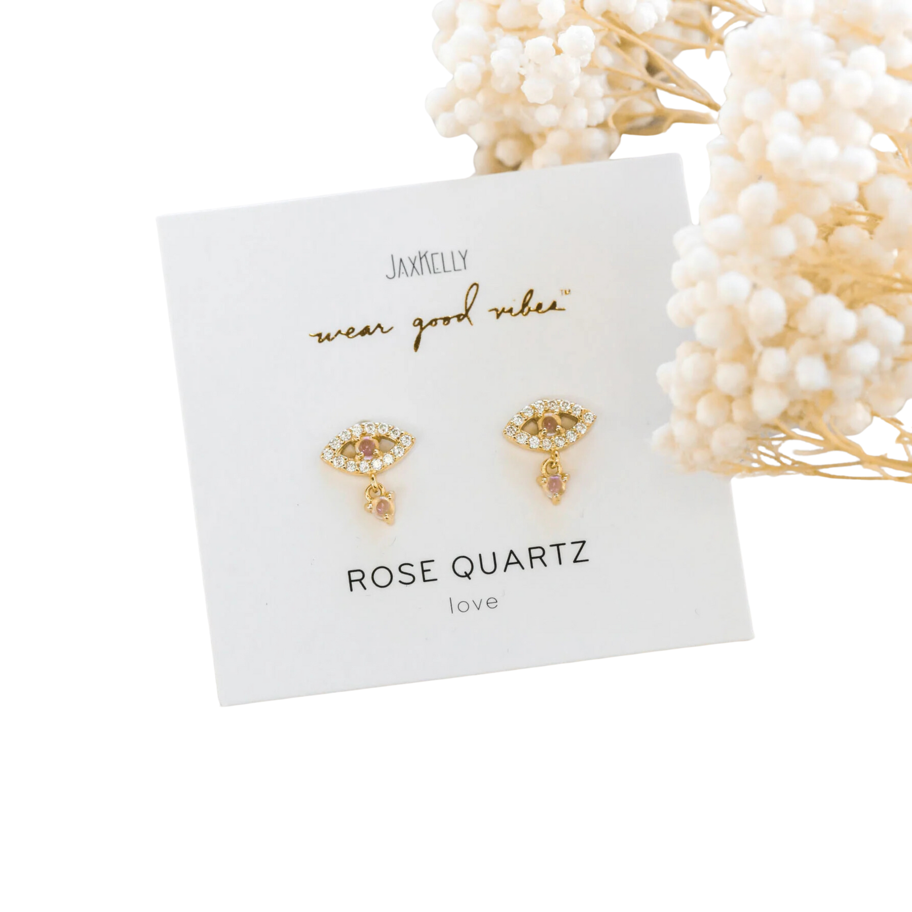 An encrusted evil eye guards against misfortune while bringing good luck to the wearer. A delicate drop of sweet Rose Quartz to focus energy on compassion and understanding.