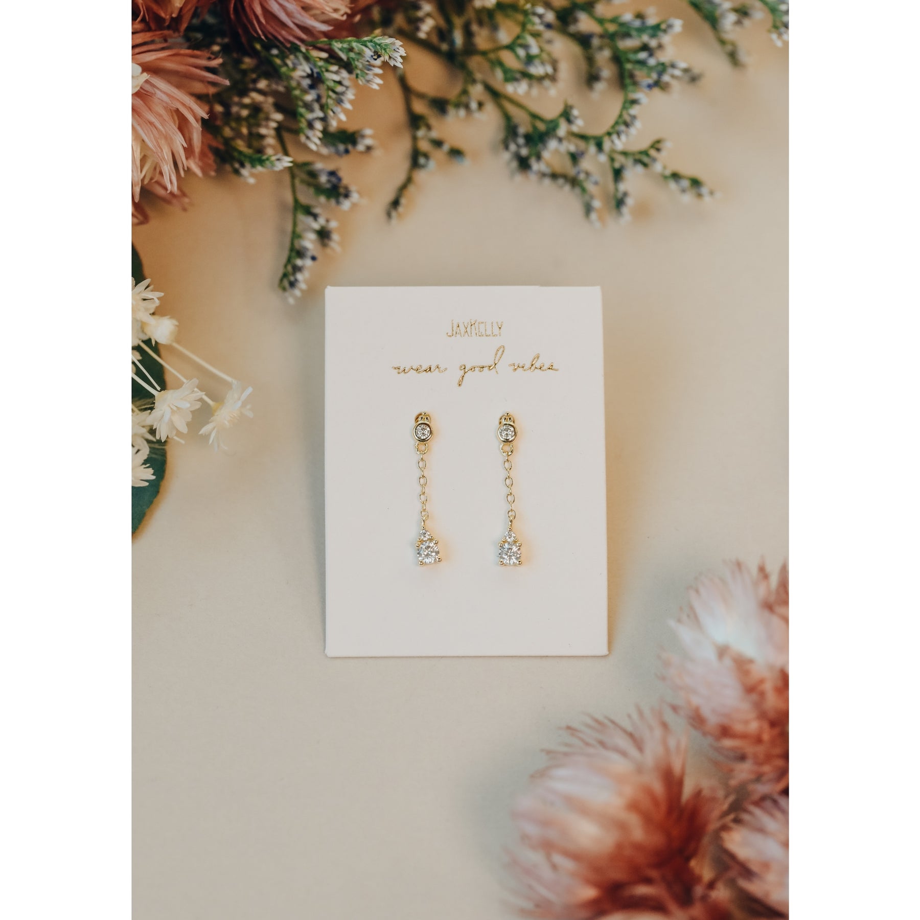 A tiny trio of golden spheres arch over a rounded CZ stud, anchoring a soft chain of links and two stacked round set stones. Wear to your next gala, or to the grocery store.