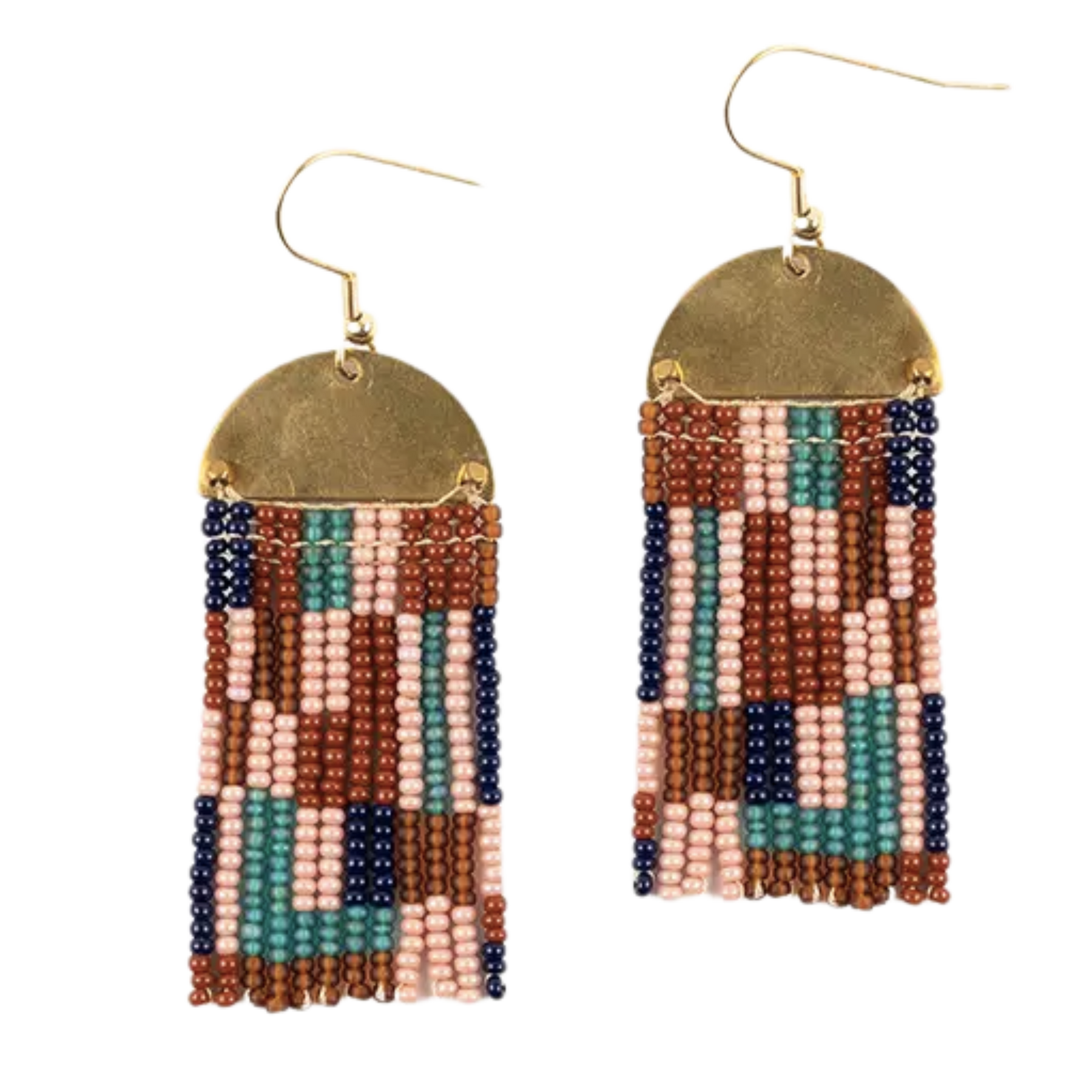 Colorful bead fringe is topped by a brass half moon shape. Gold plated french hook ear wire. 2.5 inches long x 1 inch wide The Beaded Patchwork & Brass Earrings are handmade in a fair trade workshop in Guatemala.