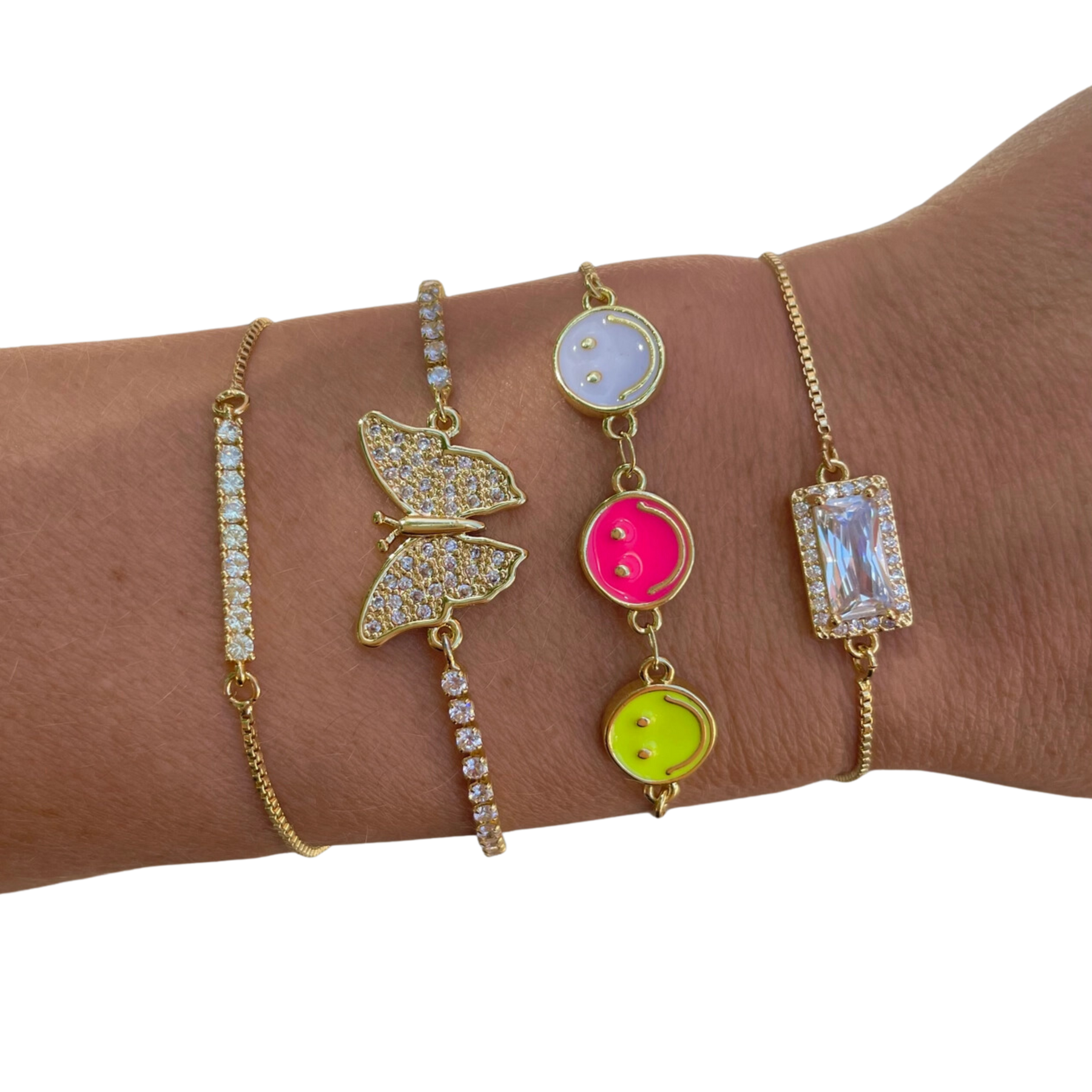Obsessed with our beautiful gold slider bracelets. Mix 'em, match 'em, love 'em! These bracelets are sold separately by style, we love the way these 4 merchandise together! These have adjustable beads on the back, making them super easy to slide on and off the wrist. Adjustable to any wrist size!