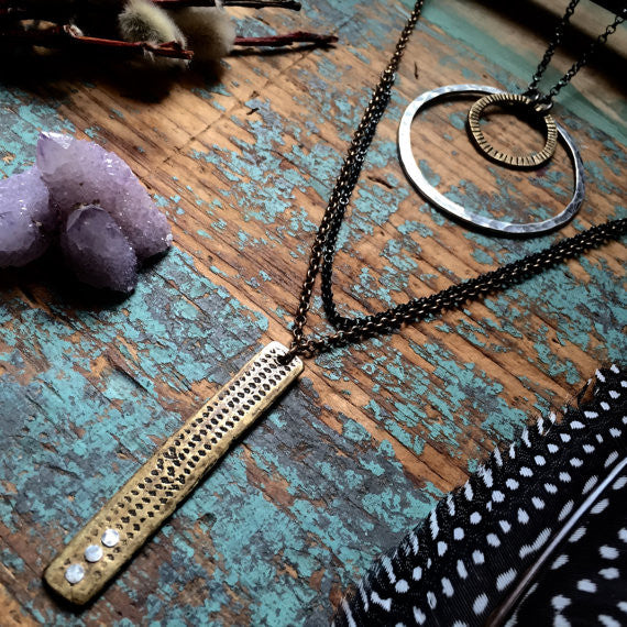 There's a different primitive "dot" pattern on each side and it's riveted with 3 sterling rivets. It's very earthy and interesting, a very unique piece. Great for layering, it comes on an adjustable brass chain (16-18") and a layered oxidized sterling chain above the pendant.