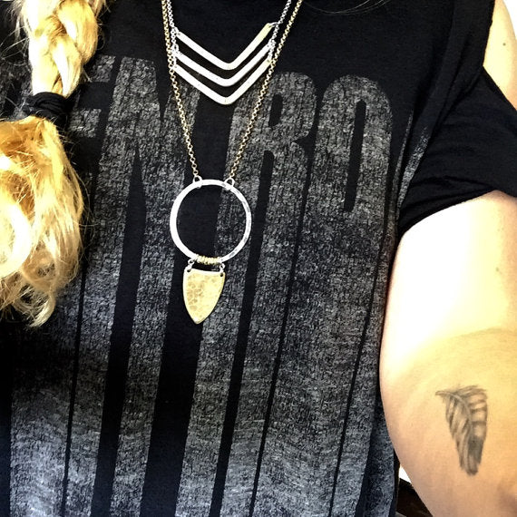 This mixed metal necklace is a great statement piece. We love how long it is at 24". Comprised of an oxidized, hammered sterling circle, a brass riveted spear and tiny brass heishi beads, it hangs on oxidized sterling chain.