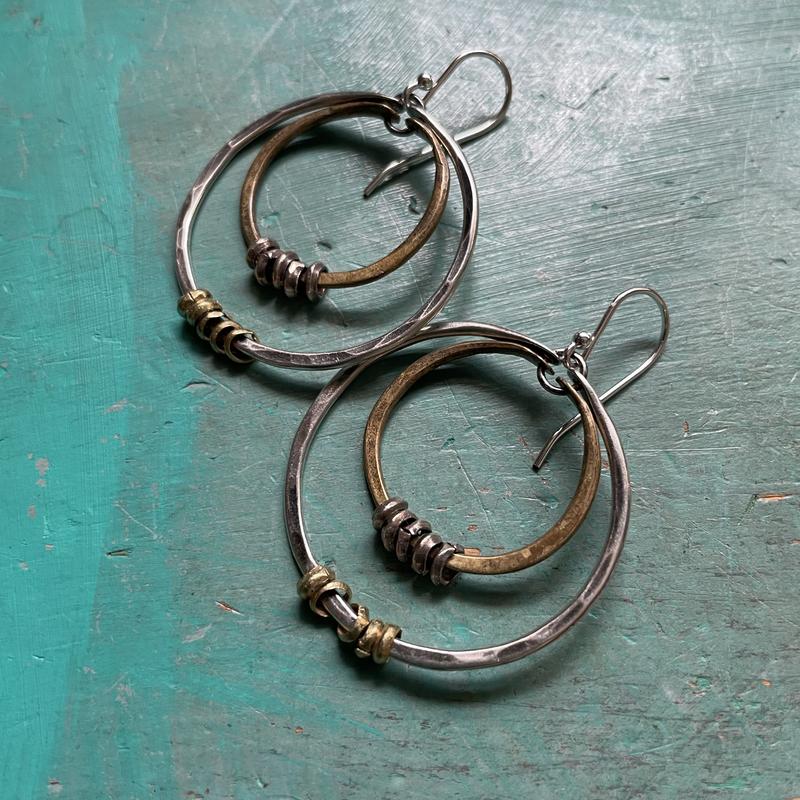 Silver on the outside hoop! These thick hammered double hoops will get noticed! Brass wire that's forged, oxidized and polished to a matte finish and an oxidized hammered silver hoop attached. Tiny silver and brass colored heishi add a nice contrast. They hang from sterling earwires.