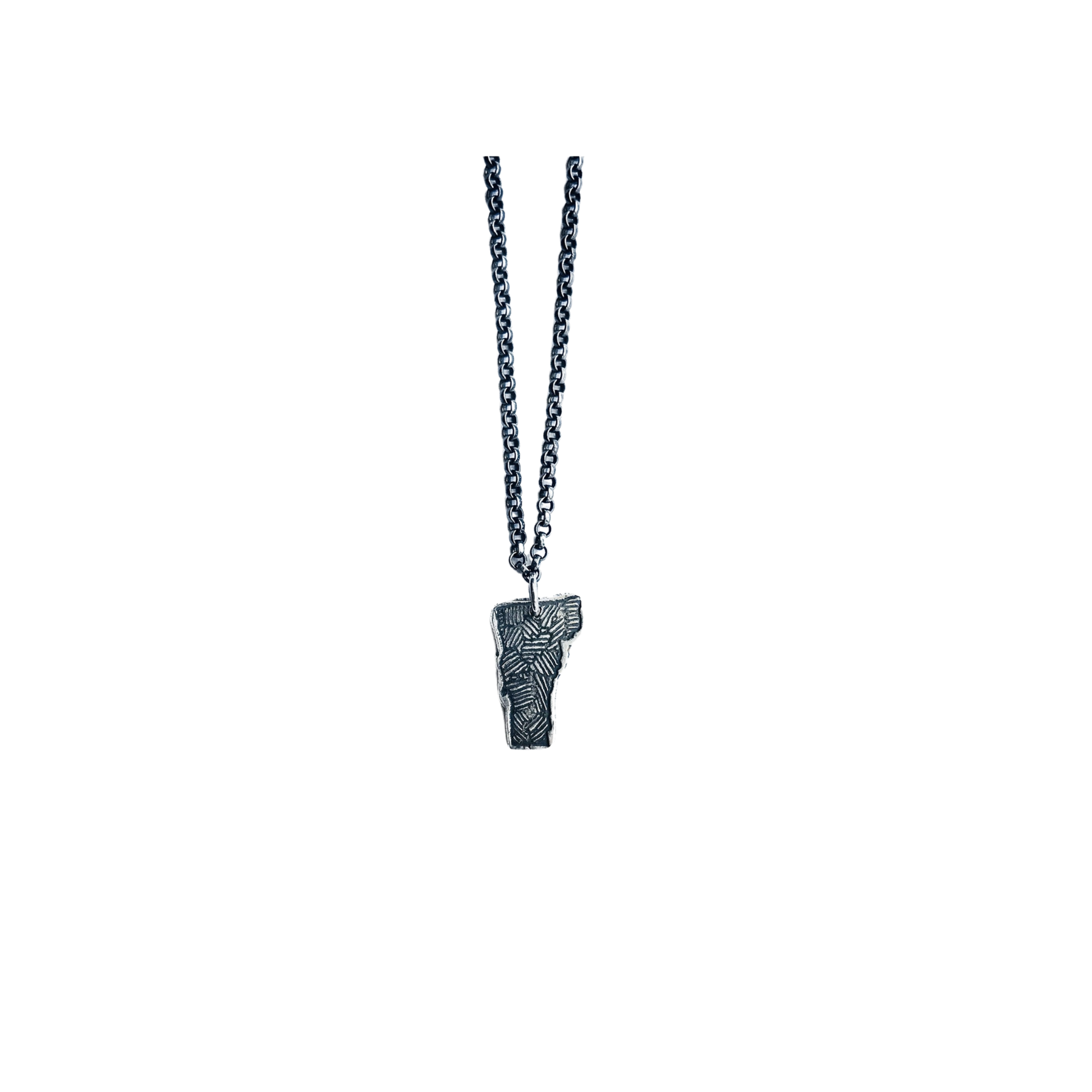 This sterling silver pendant features a patchwork pattern which delineates the 14 counties of Vermont. The VT letters are made up of my signature "patch" design. Sterling silver pendant (a bit over 1" in length) on sterling silver chain.