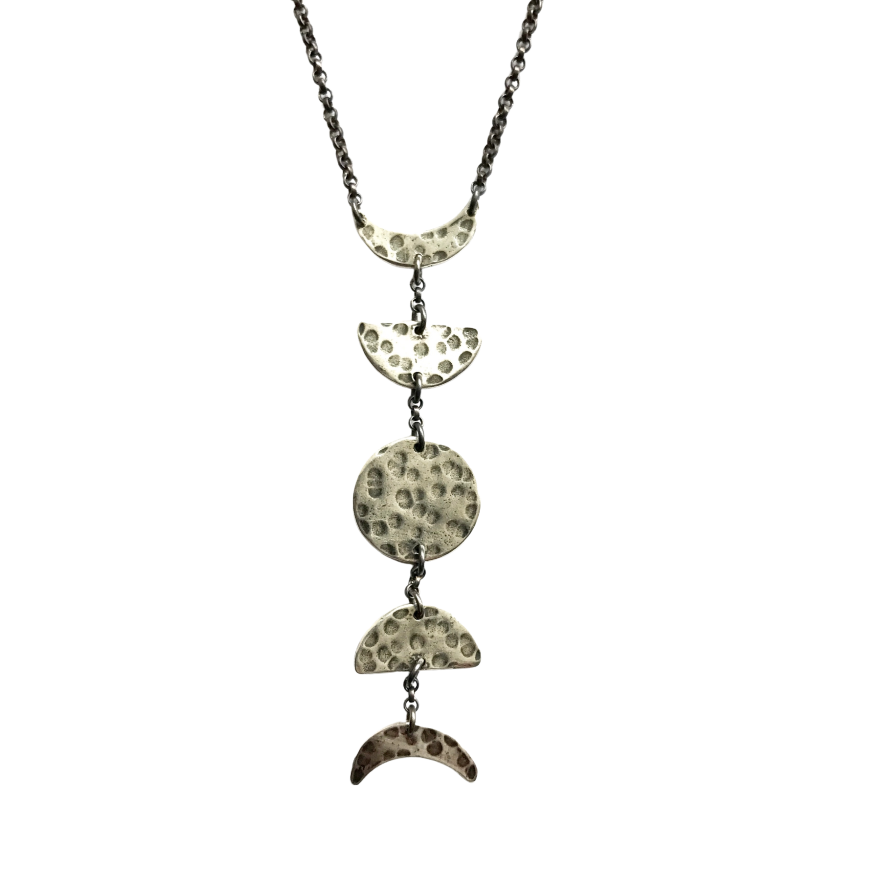 This smaller version moon phase necklace features five hammered and oxidized sterling moon shapes connected to an oxidized sterling chain. Adjustable 16-18" long chain. Jewelry for a Goddess. Moon phase is 3" long and 3/4" wide.