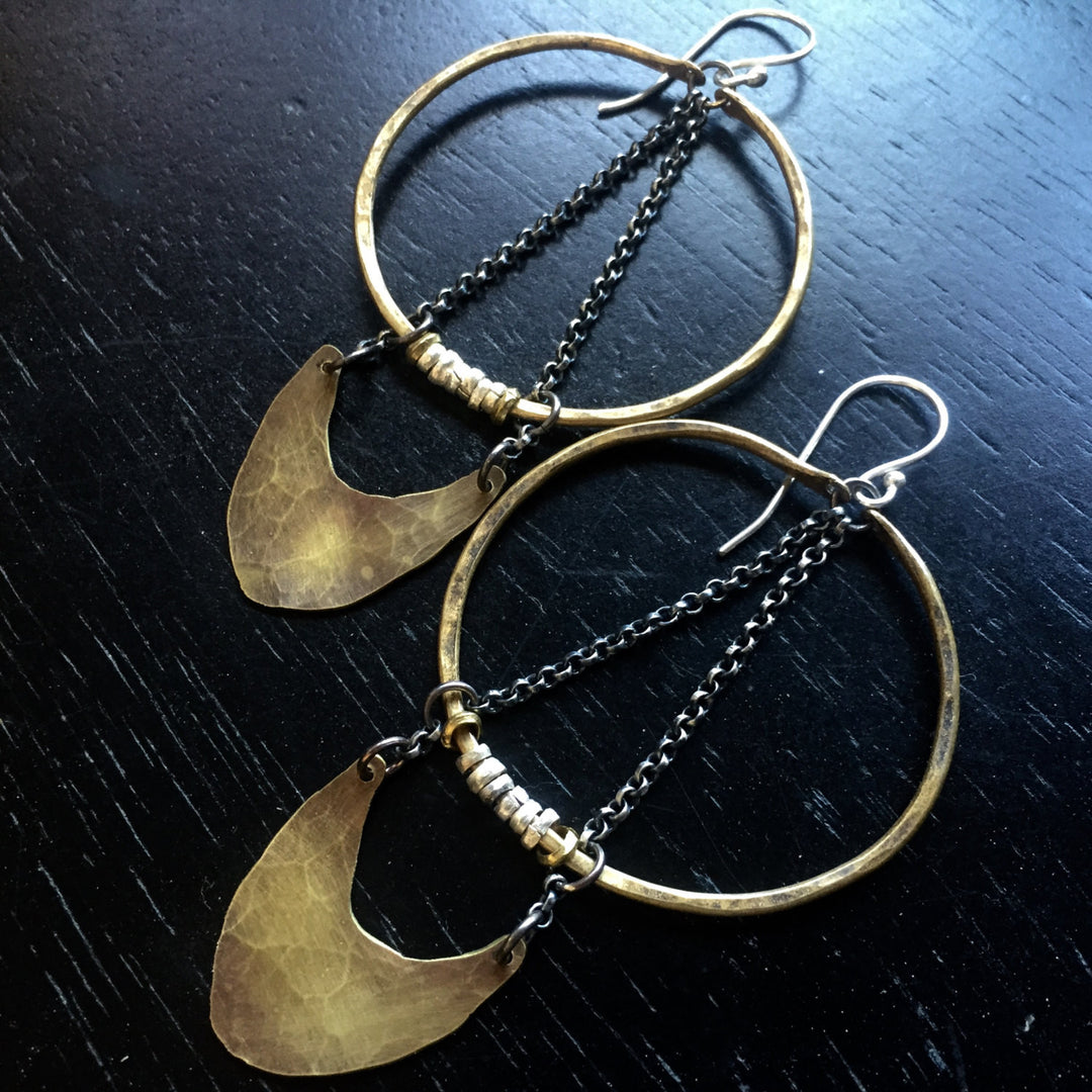 "Keyhole" Mezzaluna Earrings - Brass Hoop w/ Wide, Hammered Silver Blade