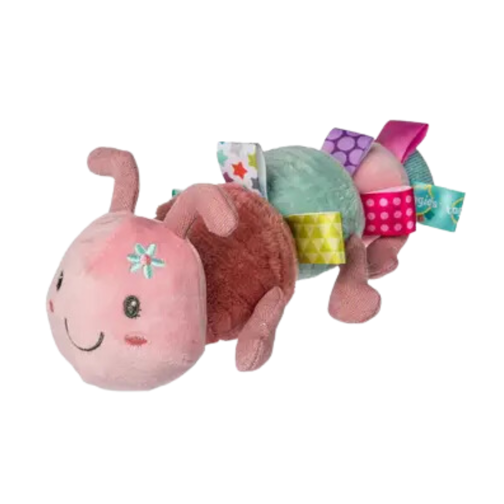 This slinky, smiling caterpillar soft toy in soft greens and pinks. With a segmented body, six legs, and 9 Taggies ribbons, she is ready to crawl into your heart.