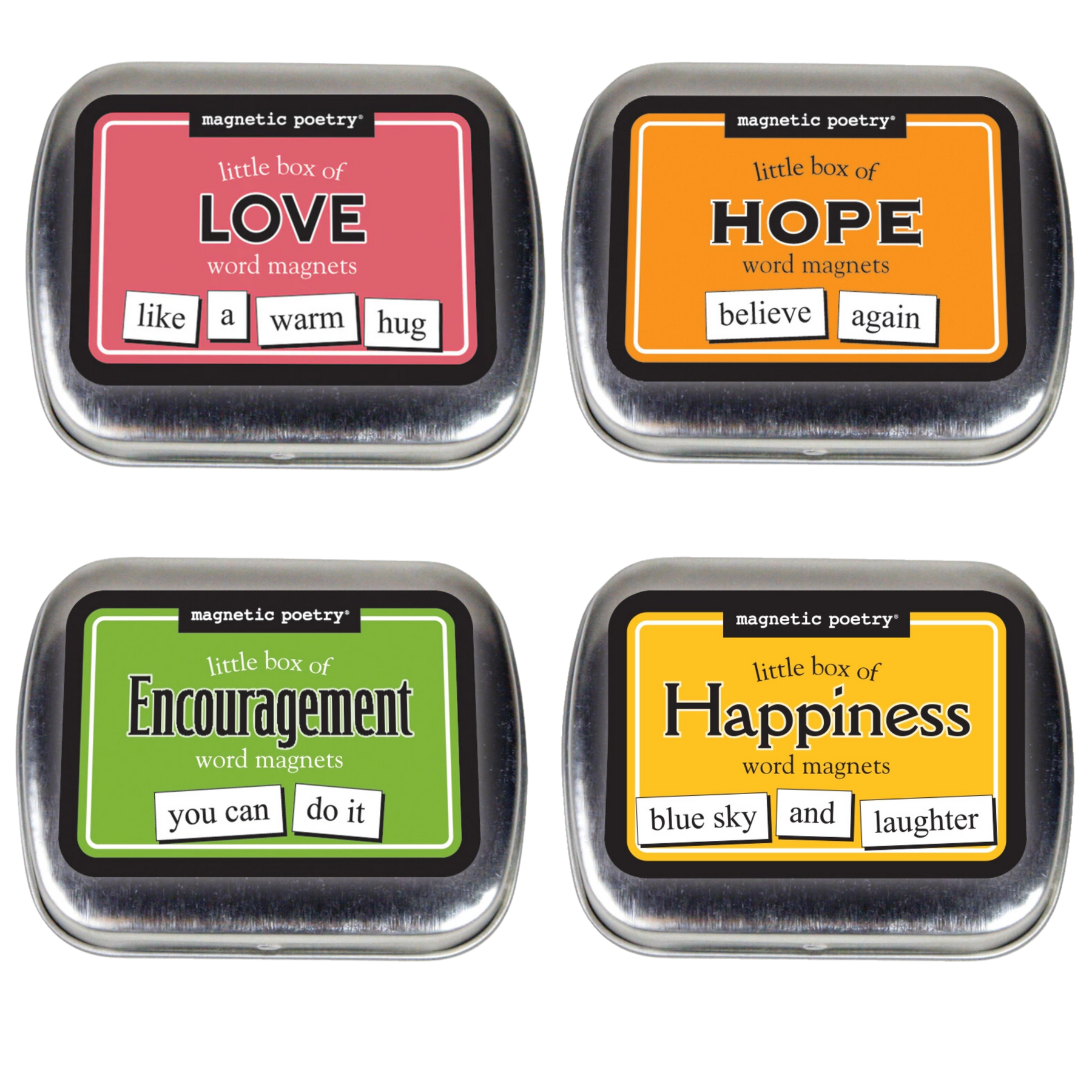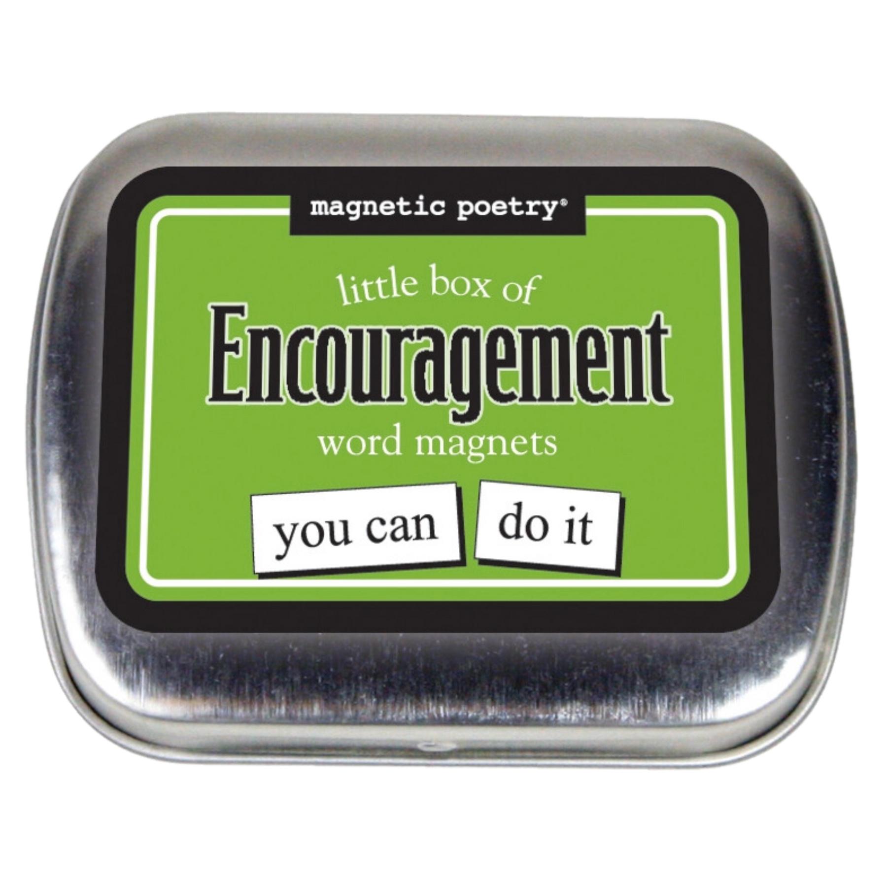 A tiny tin of inspiration! The Little Box of Words is filled with 72 themed magnetic word tiles to spark creativity, positivity, and heartfelt messages. Choose from Hope, Encouragement, Love, or Happiness to craft small but meaningful poetry on any magnetic surface.