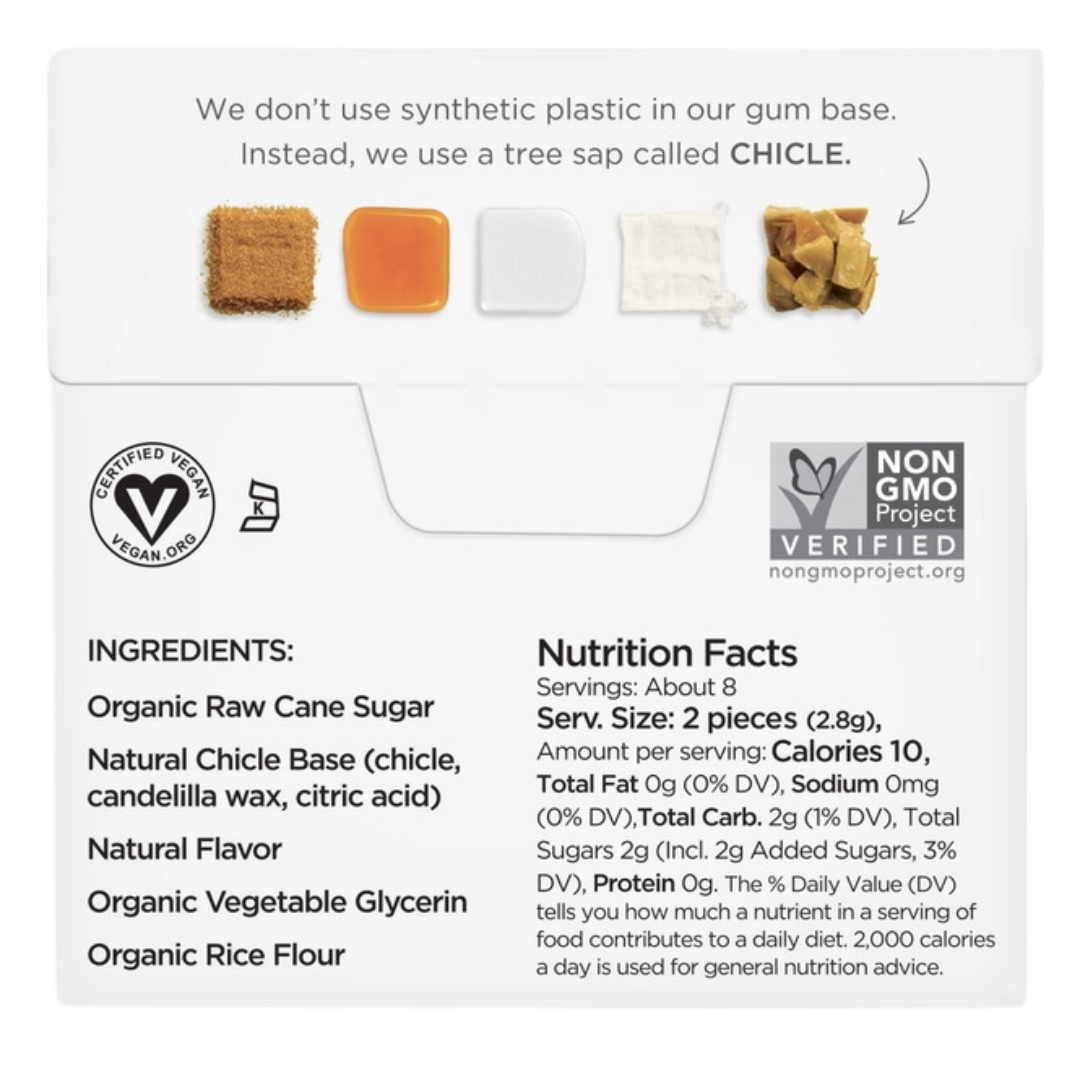 Ingredients: Organic Raw Cane Sugar, Natural Chicle Base (chicle, candelilla wax, citric acid), Natural Flavor, Organic Vegetable Glycerin, Organic Rice Flour