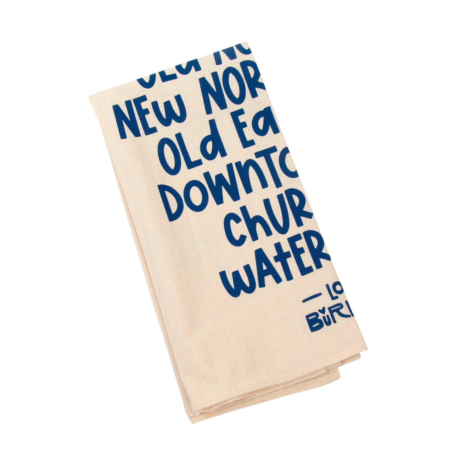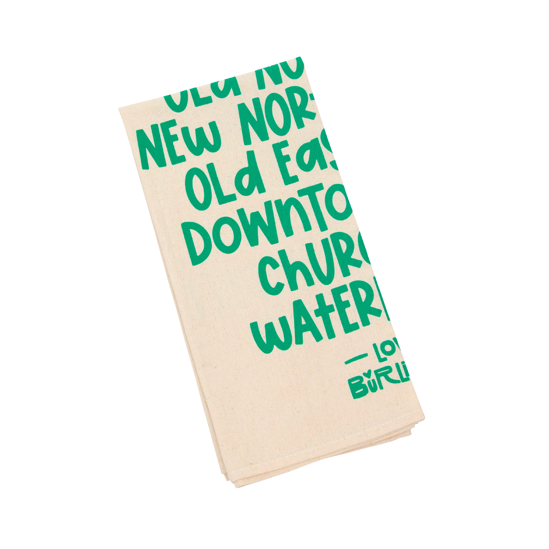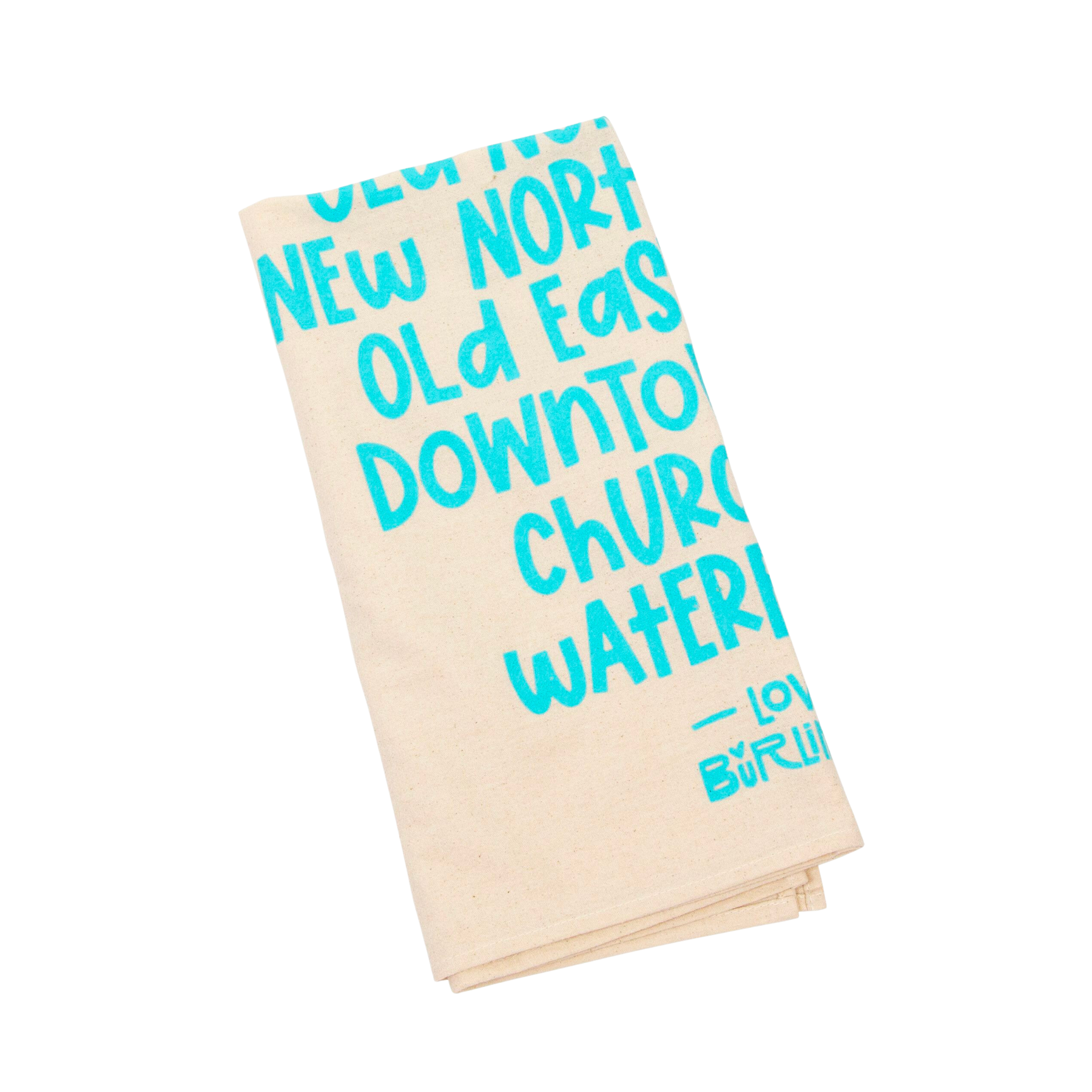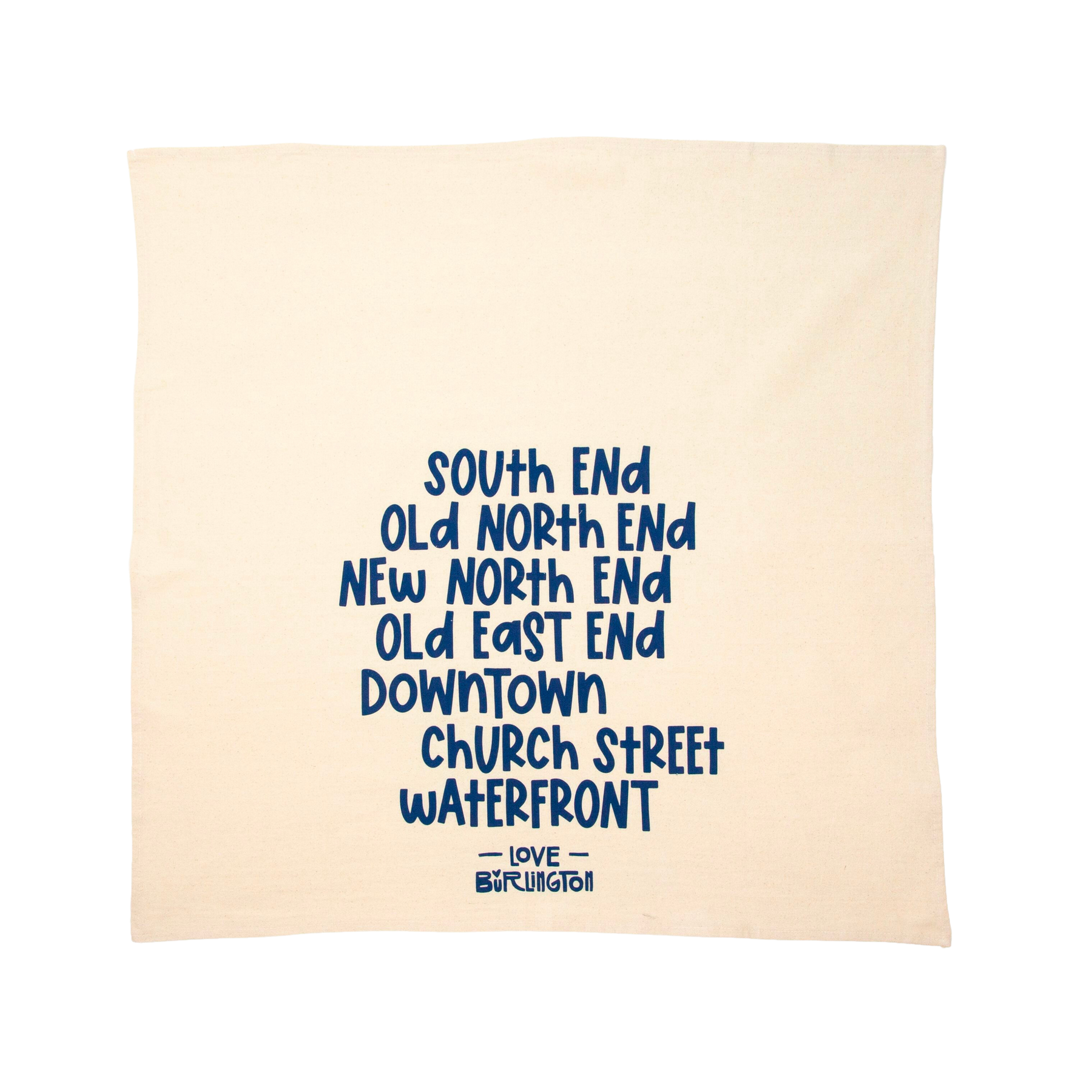 The Love Burlington Tea Towel comes in a variety of colors and lists the sections of Burlington, VT: