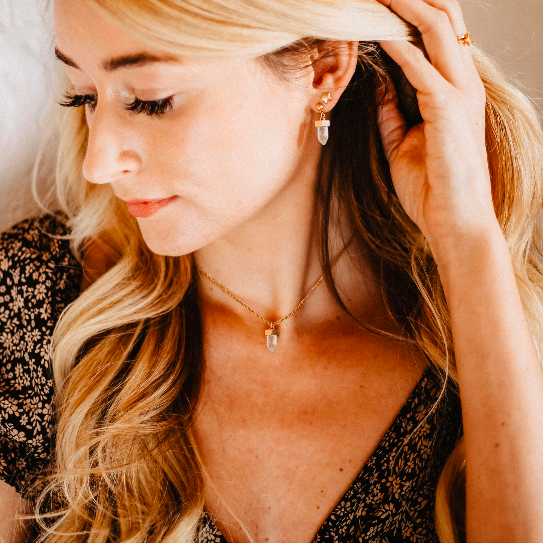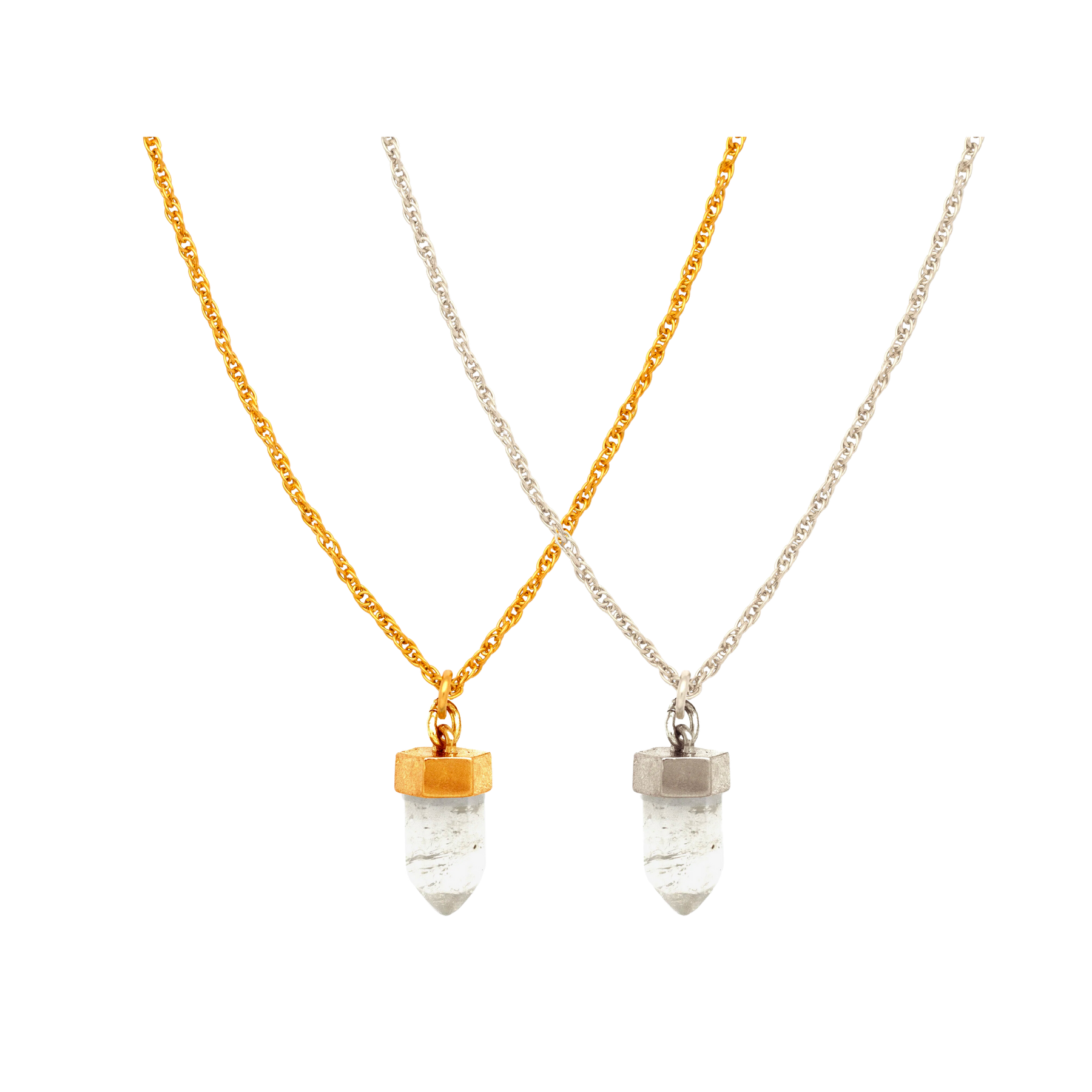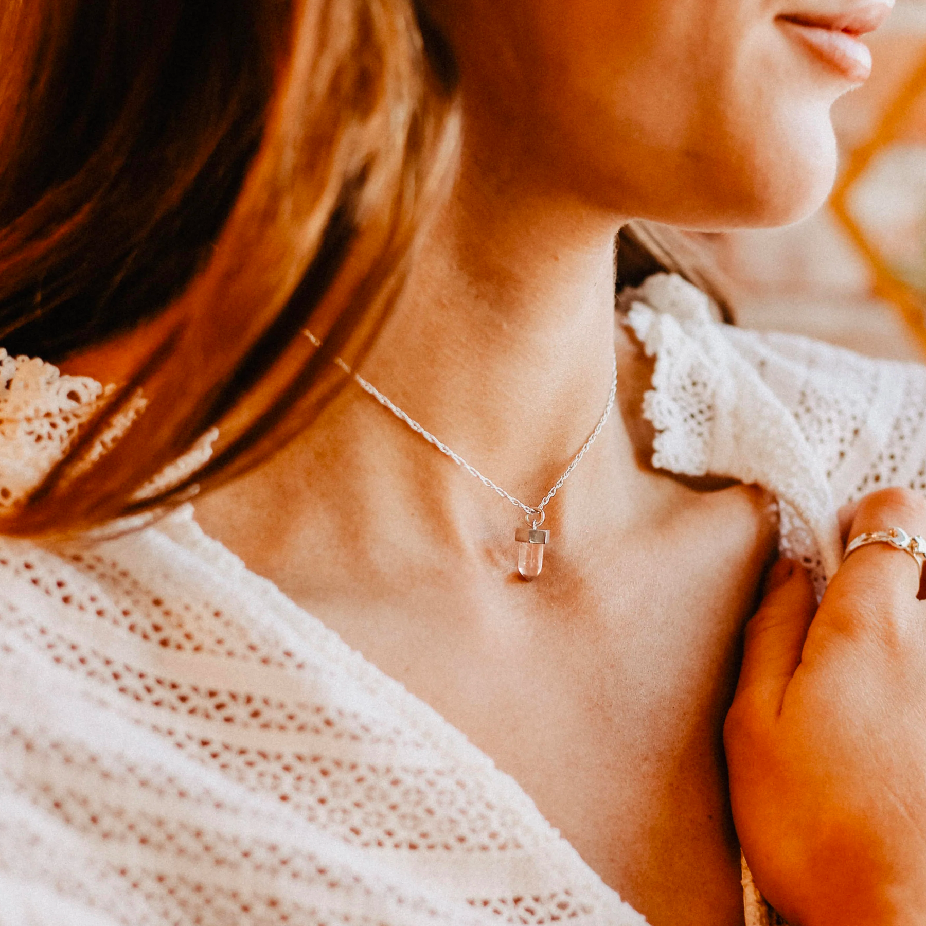 A tiny Quartz Crystal pendant hangs on a choker chain.