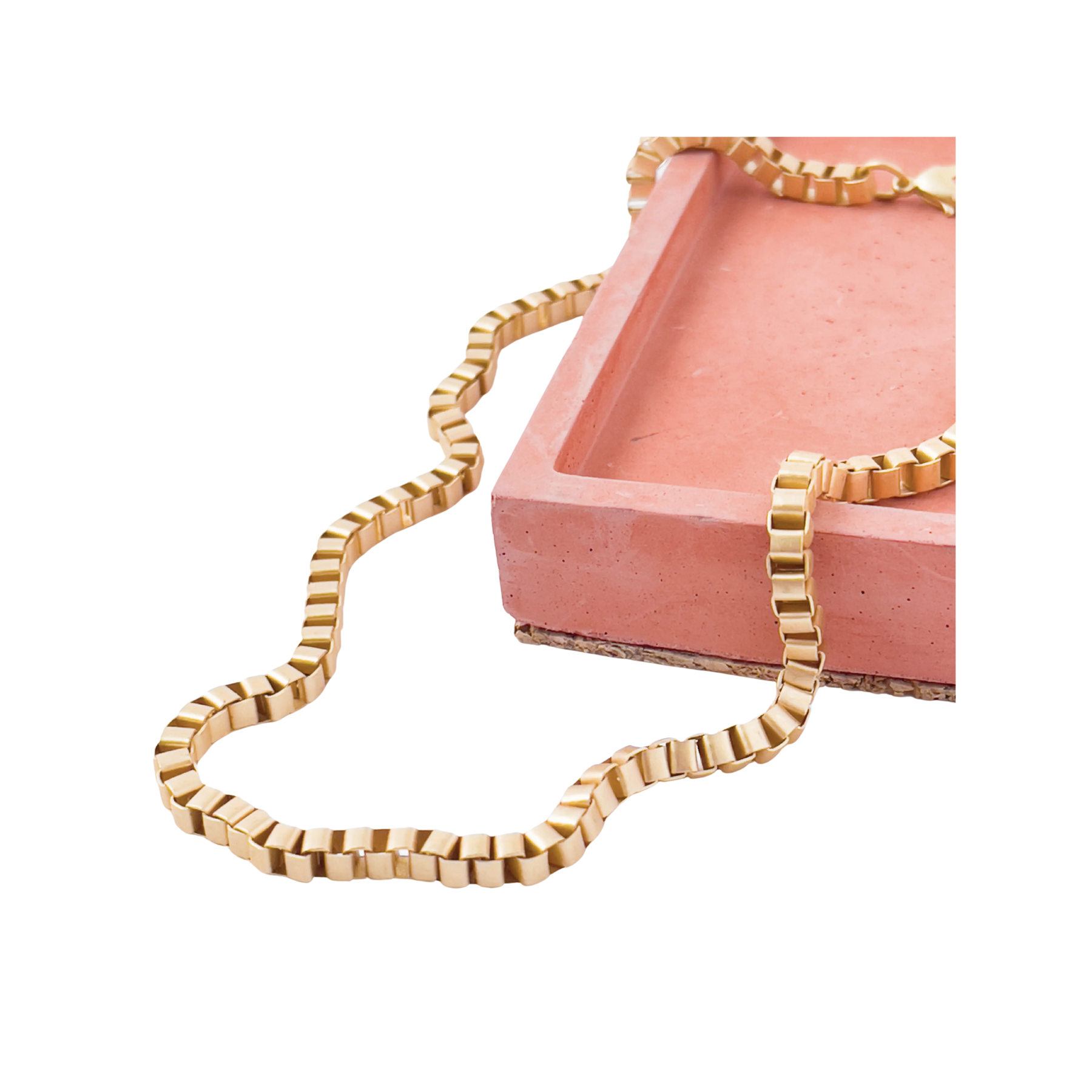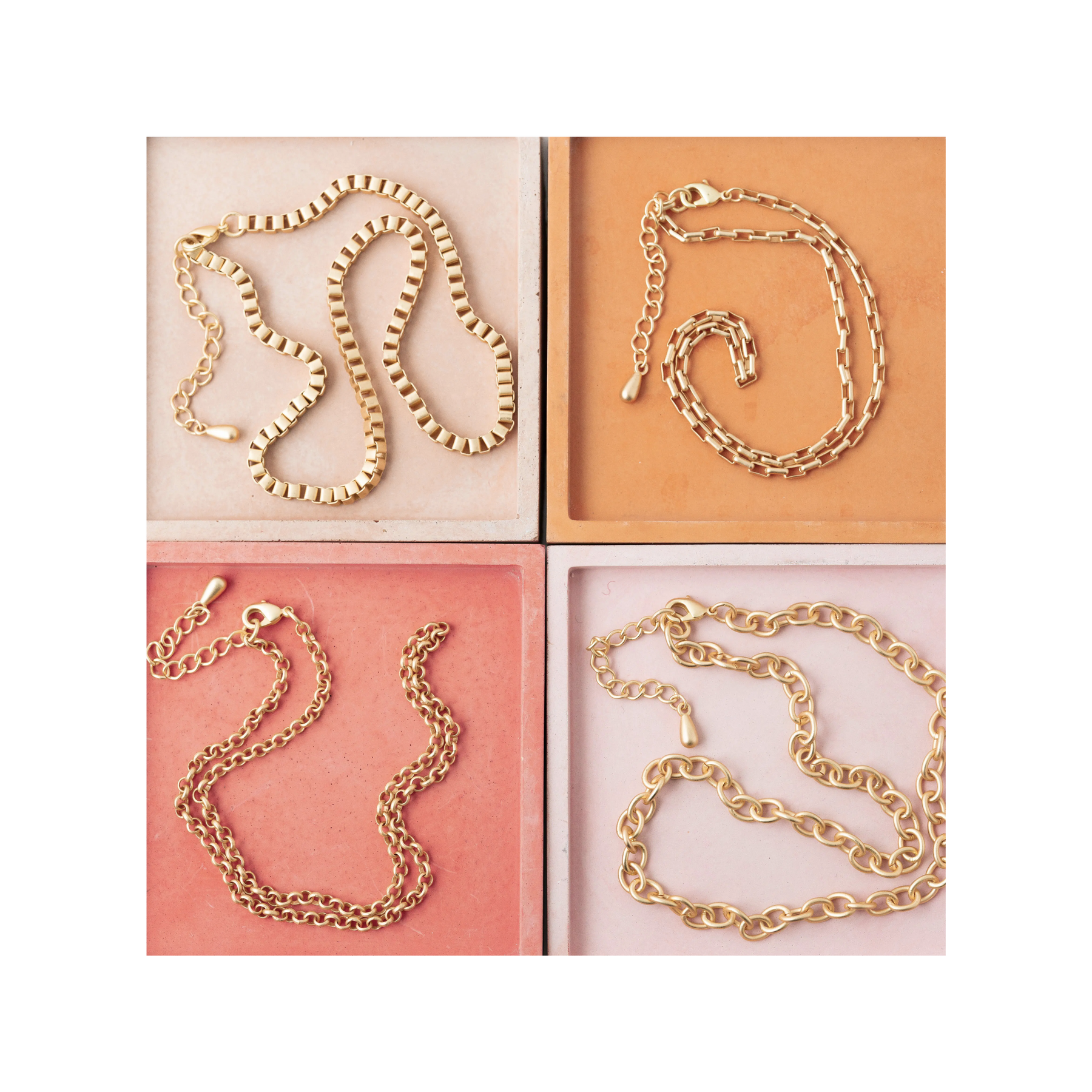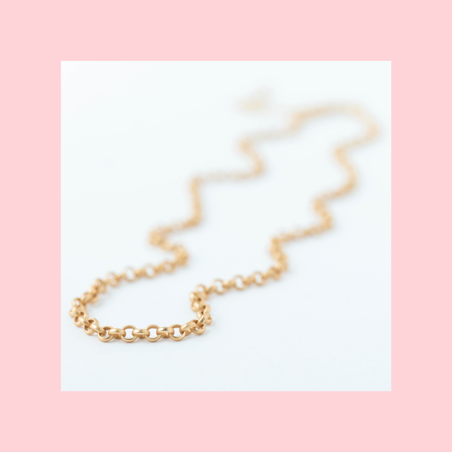 A beautiful electroplated plated chain necklace in a matte gold finish over brass with a lobster clasp and a 2" extender. The necklace is free of lead, nickel, cadmium, and other irritating components. Beautiful on its own or as layered.