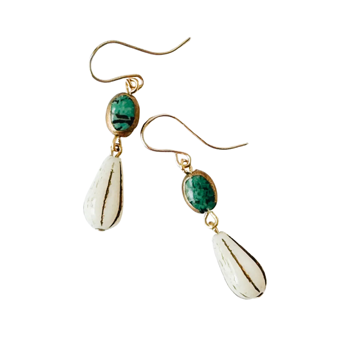 These 1" long earrings are made with a small genuine Turquoise stone dipped in gold and cream and copper glass bead 24K gold plated ear wires. The details: 1" long Turquoise 24K gold plated ear wires. Handmade in Vermont
