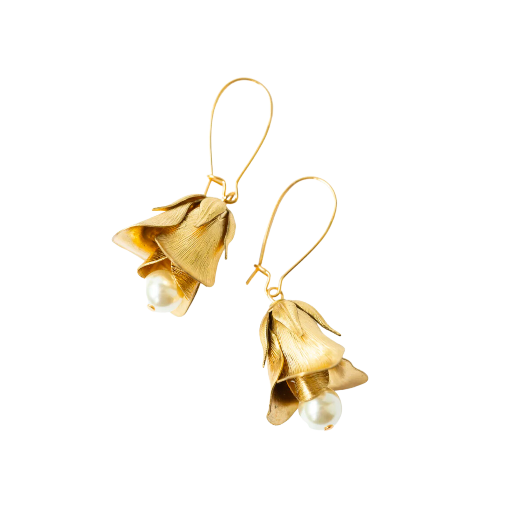 Lovely Golden brass Flower bud earrings with a Preciosa Crystal Pearl bead hanging from long oval Gold Plated Ear wires.