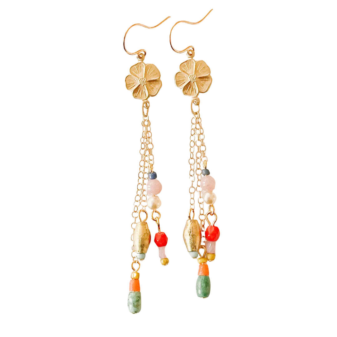 The earrings measure 2.5" long with three gold plated chains dropping down from a small golden brass flower, the colorful beads are a mix of different beads and gems including a genuine turquoise bead, Czech glass beads, a tiny crystal pearl, fair trade beads, recycled brass beads, and vintage beads.