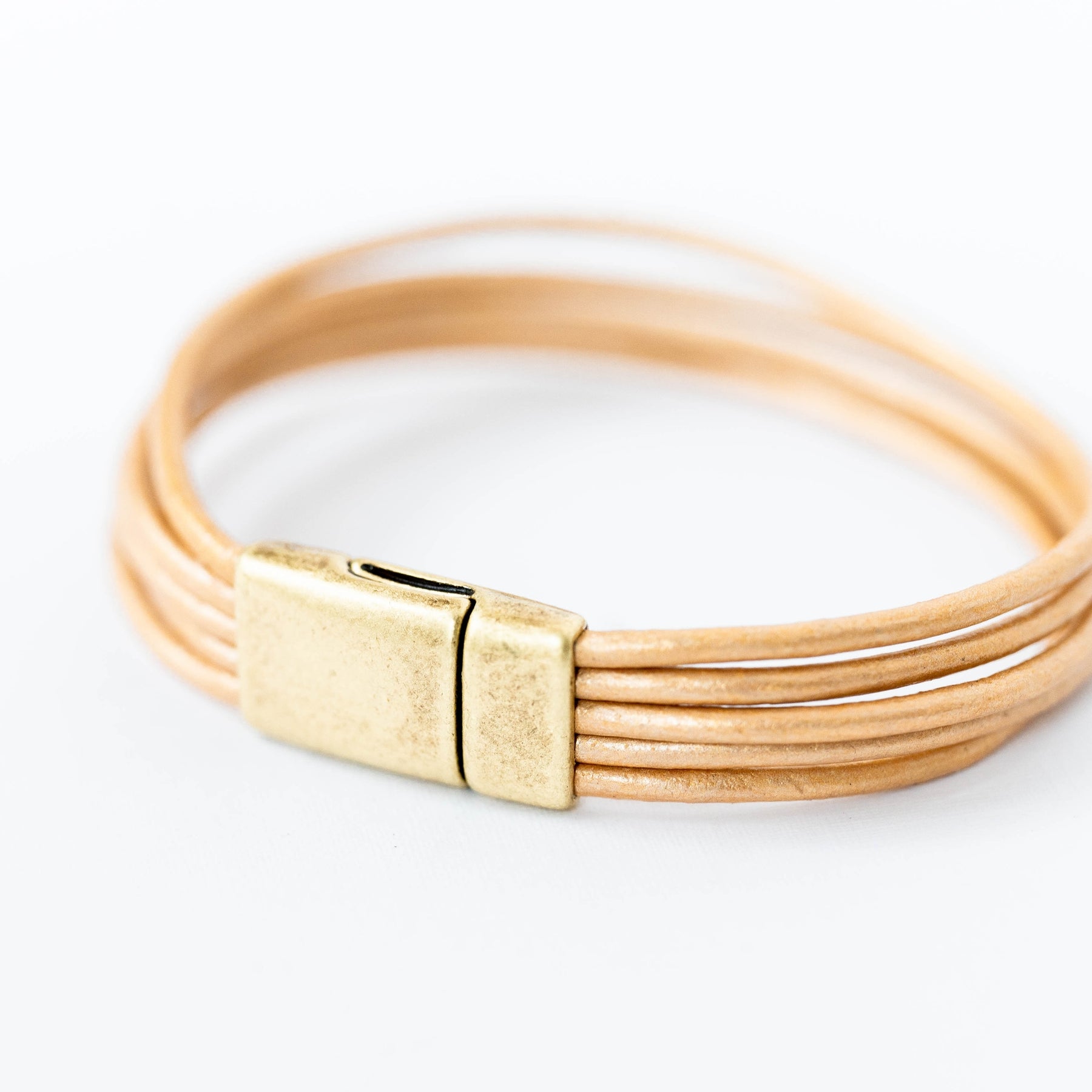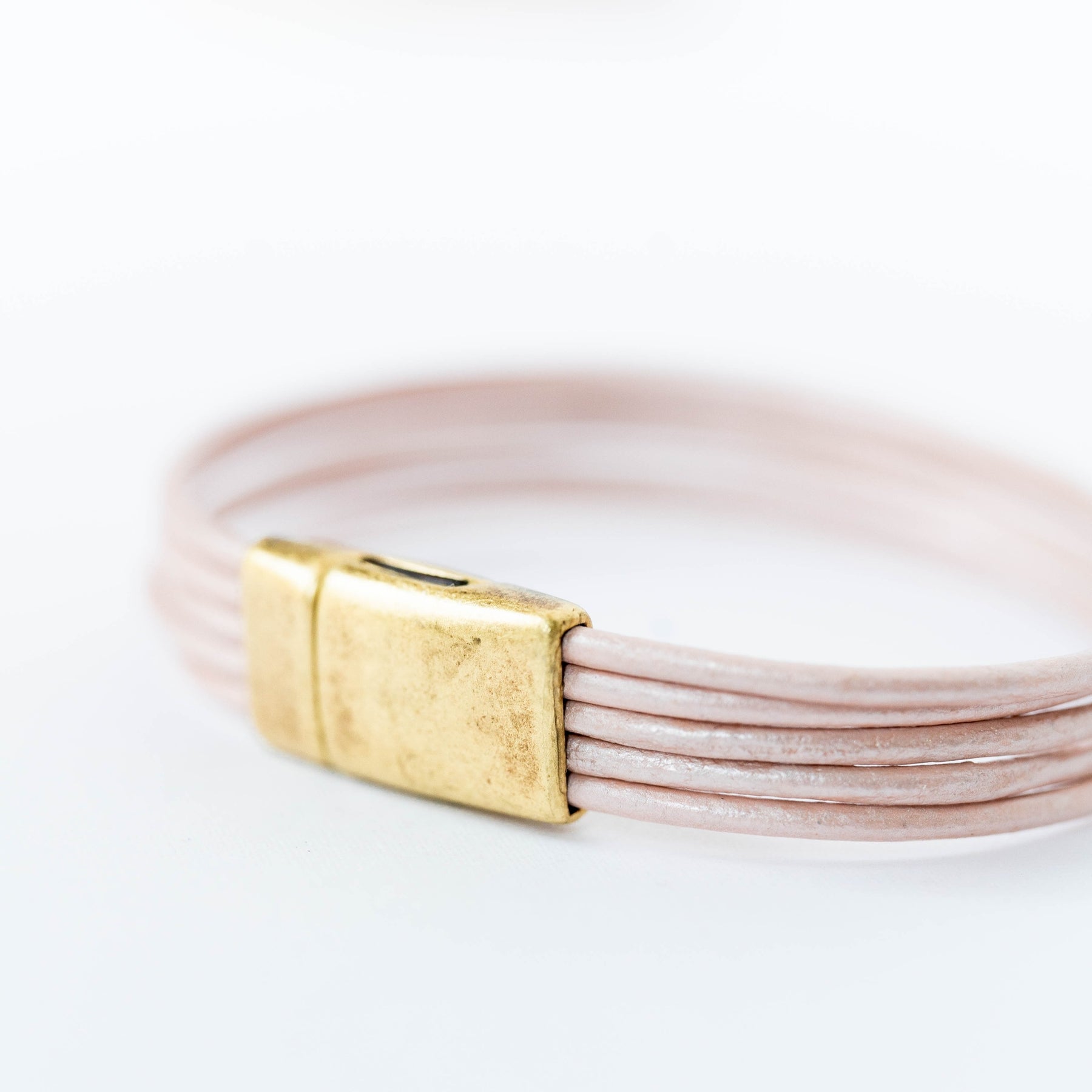 100% genuine leather cord bracelet with a solid antique brass magnetic clasp. The bracelet is made with five thin leather cords in lovely shimmery colors.