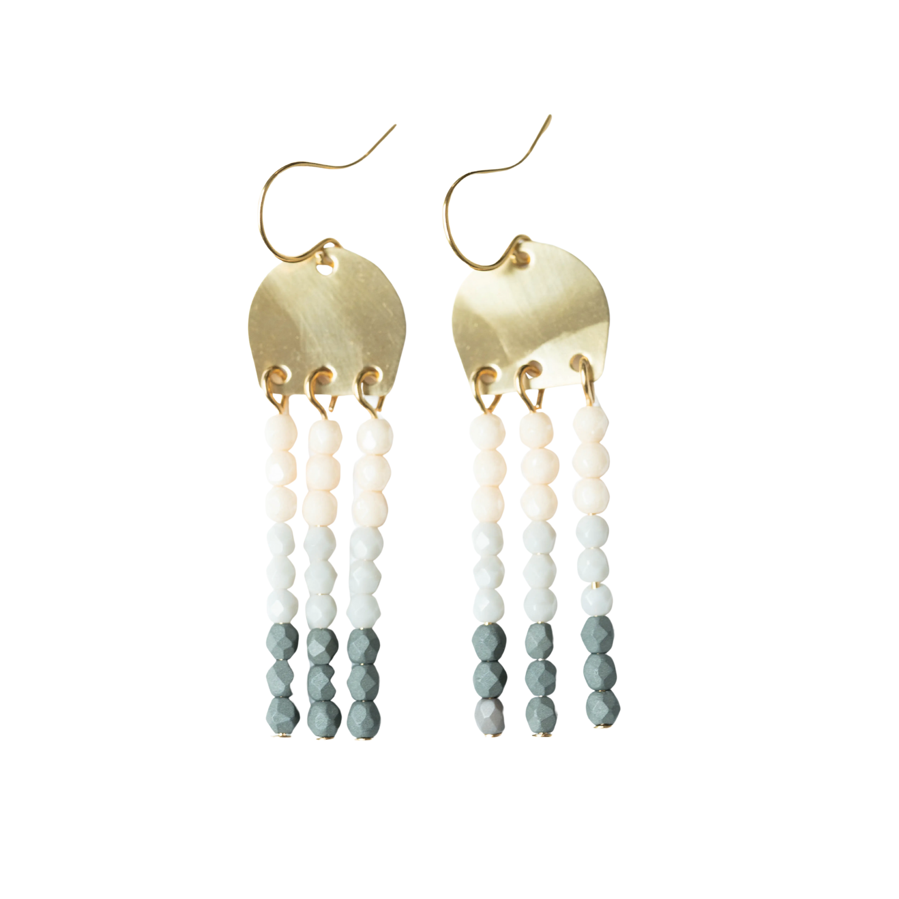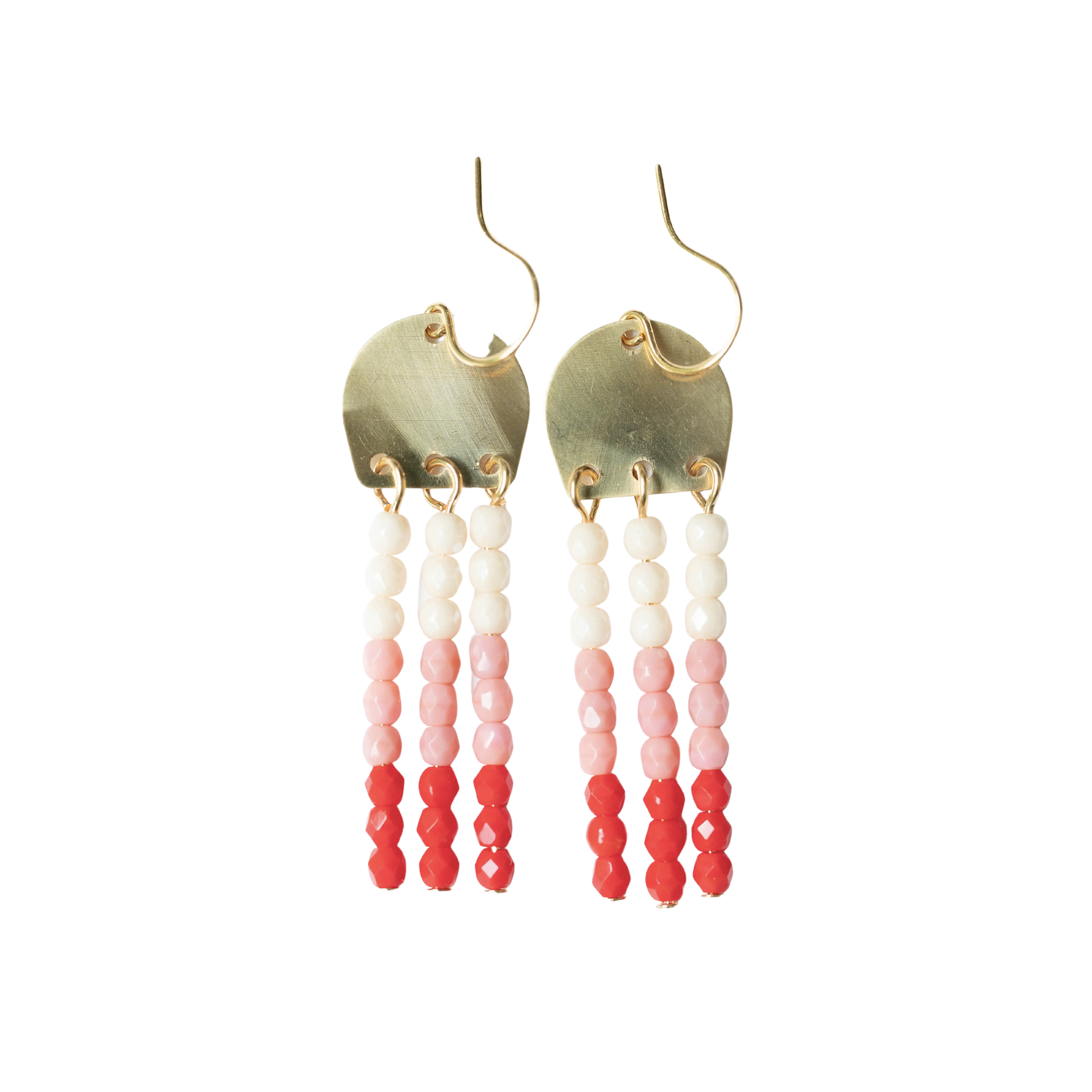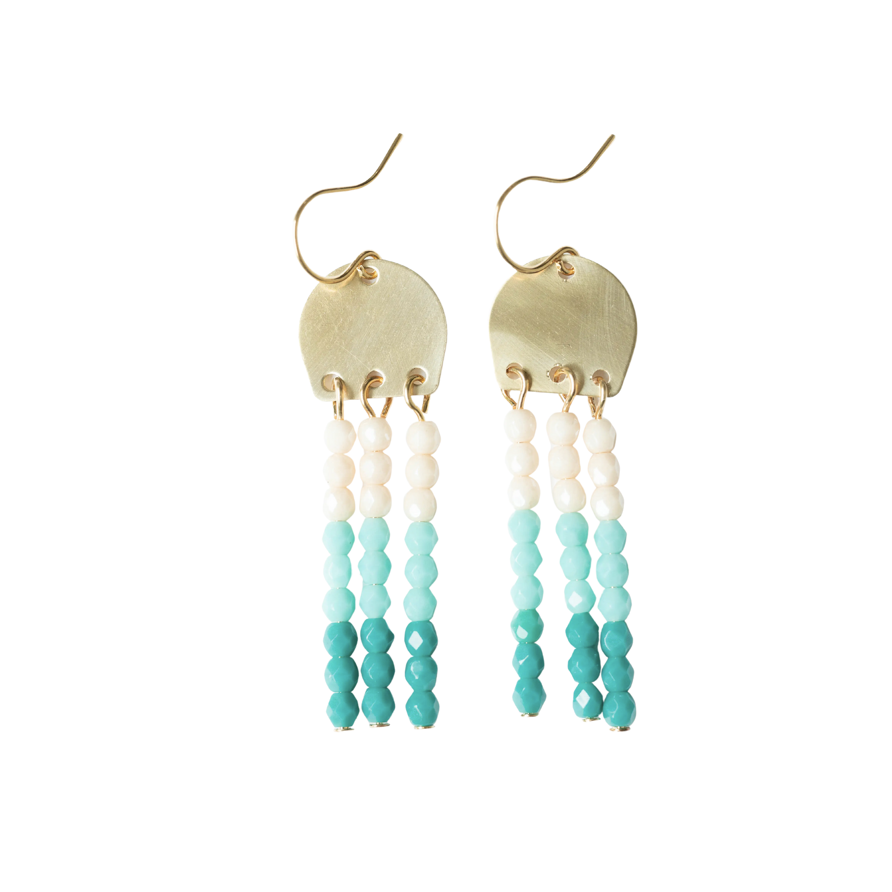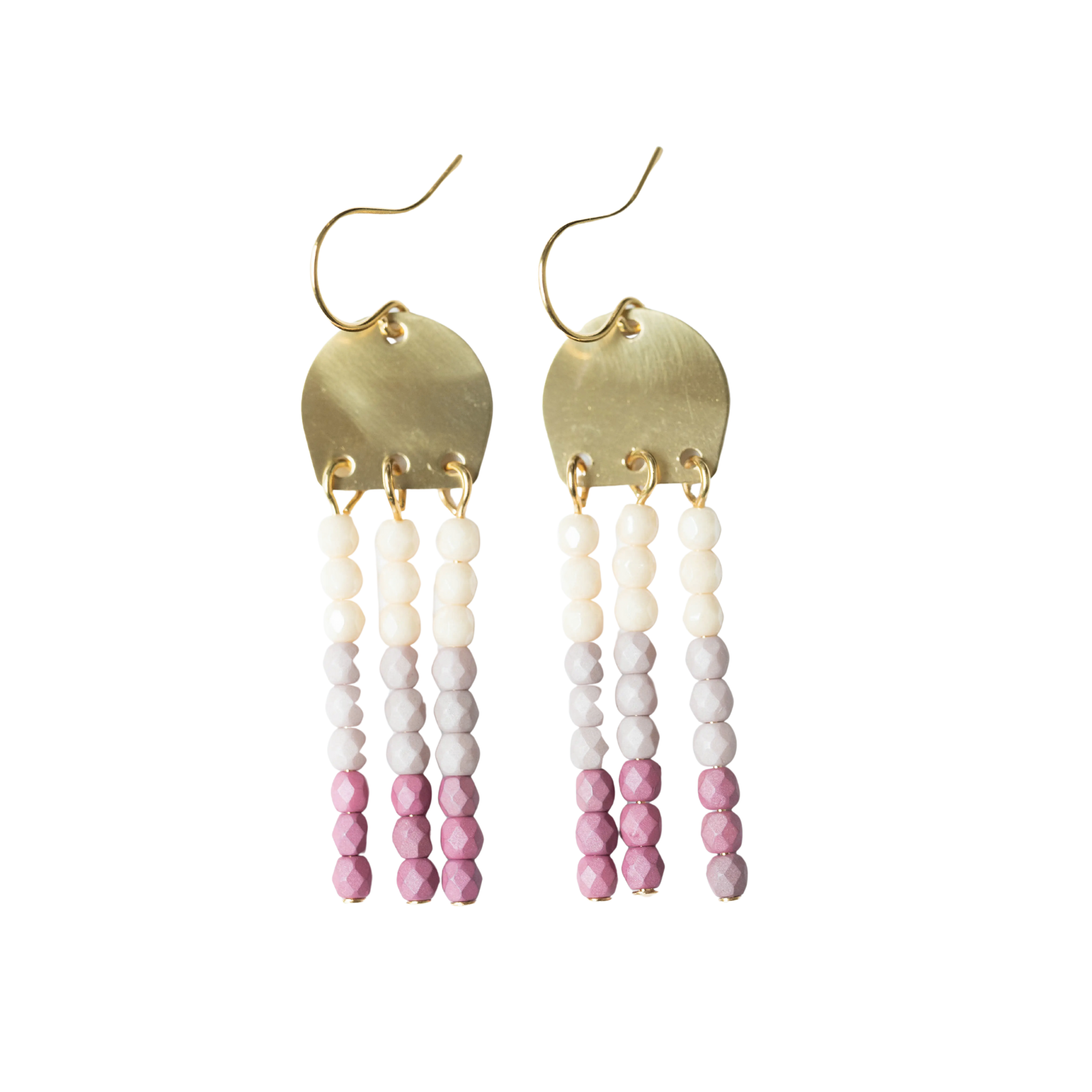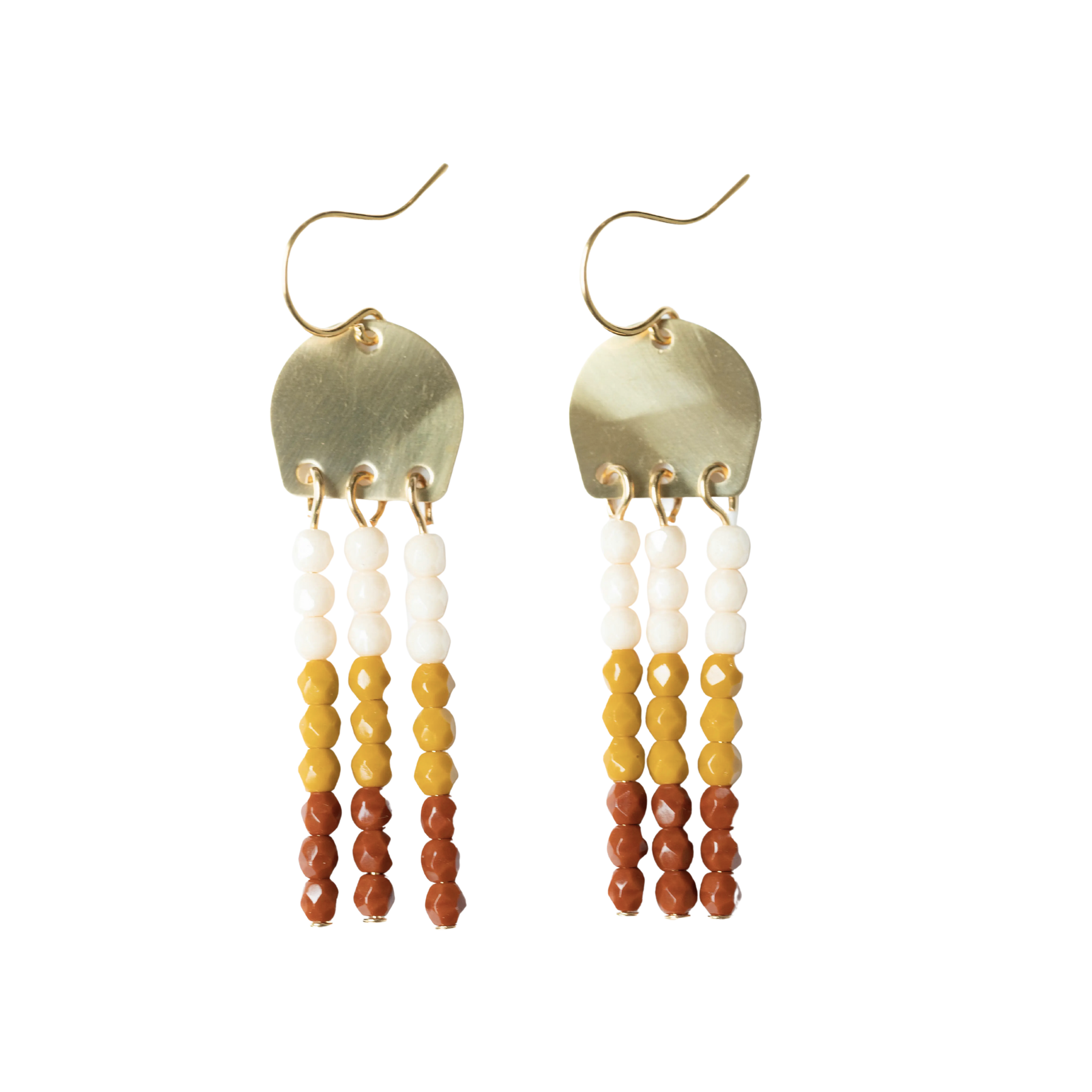 Lovely 1.5" long brass earrings with three rows of little 3mm beads. The ear wires are 24K Gold Plated